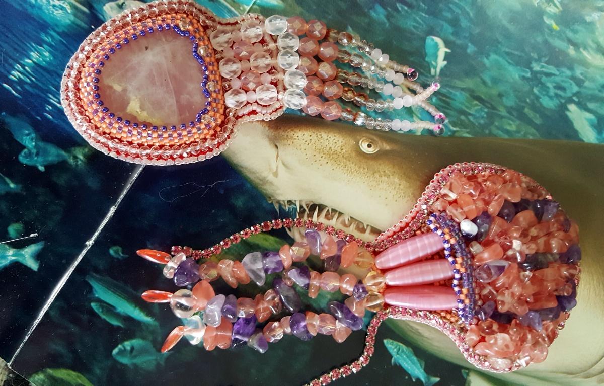 Взгляд упал на кучку всякого-разного розового, что я повытаскивала для щупалец — среди бусинок были и низки кварцевой крошки. Идея пришла мгновенно, сделать медузку из каменных сколов. Таким образом, появилась эта парочка.