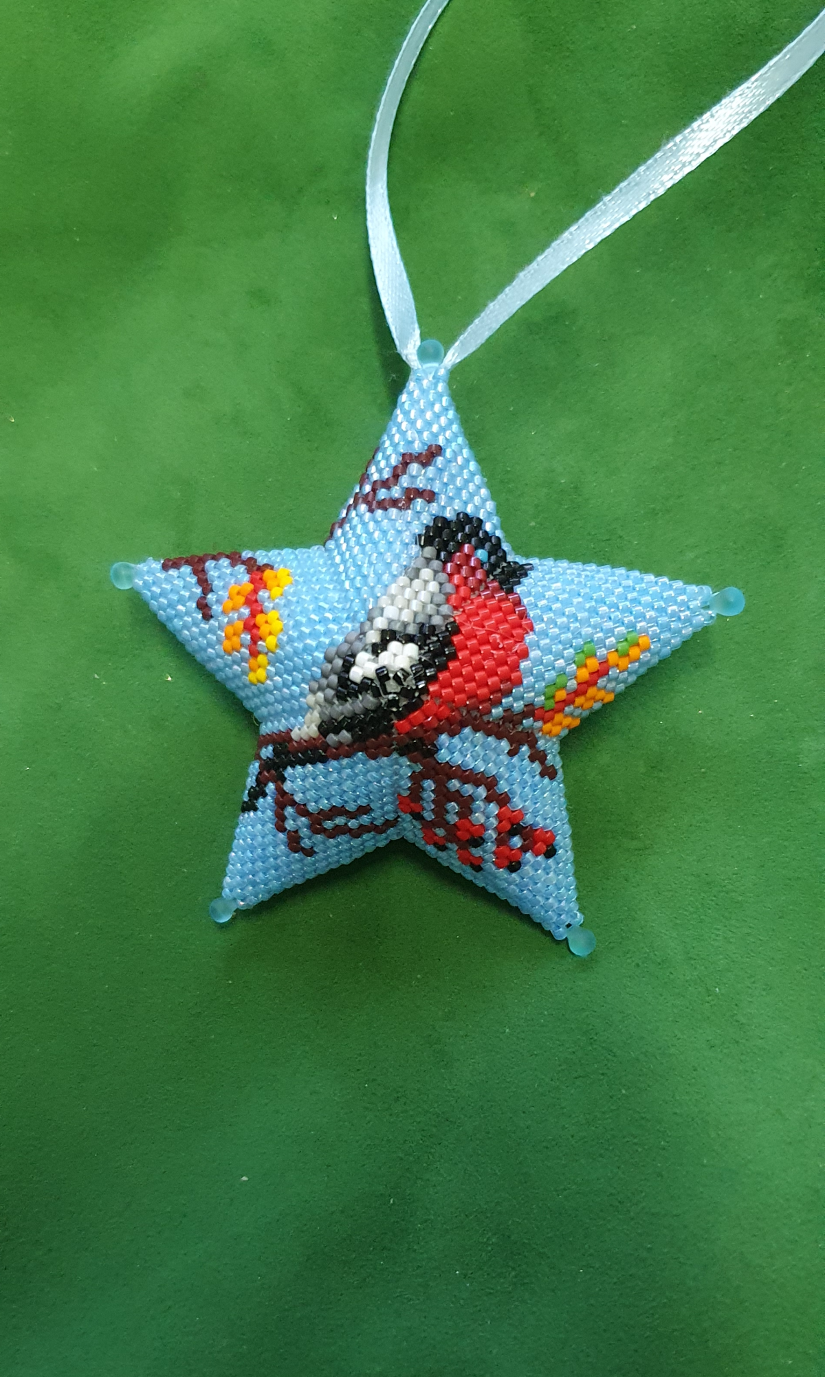 Была у меня уже звезда со снегирём. Но так я люблю этих птиц, что не смогла отказать себе в удовольствии сделать новую. Есть у меня в запасах еще она схема шикарной снегириной звезды, вот специально сейчас торжественно обещаю к Новому году сваять. (Чтоб потом не срулить в кусты)