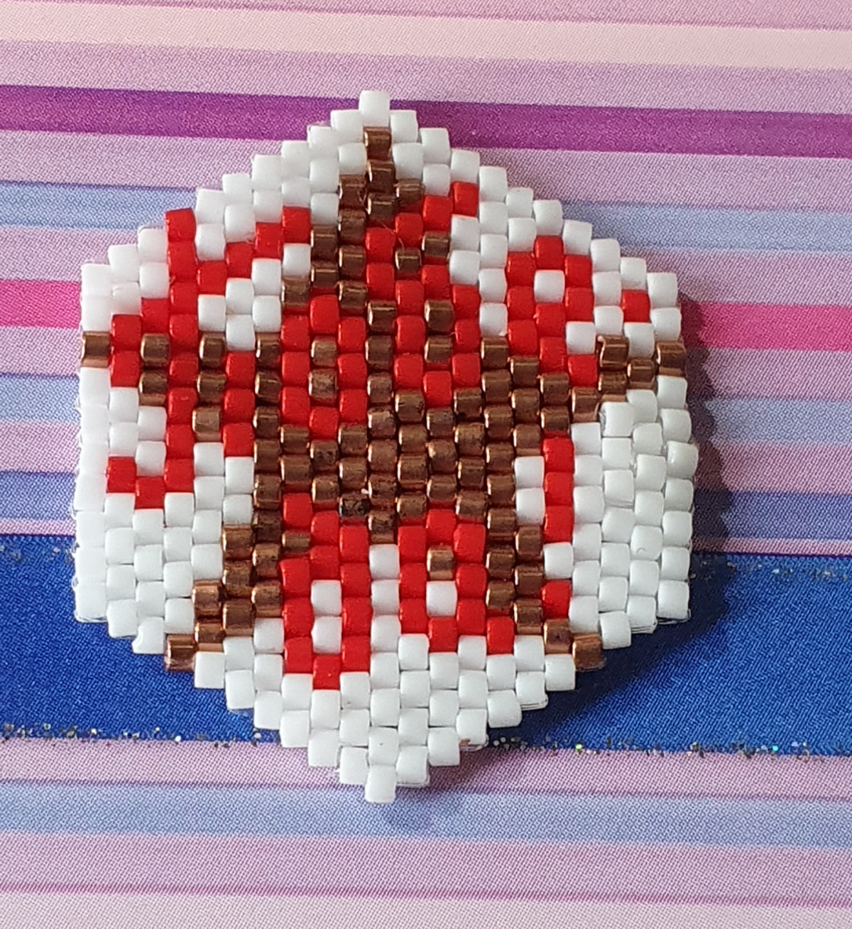 Вспомнила, что есть у меня еще маленькая вещица с символом Победы от Тани Акиндеевой. Сделала внуку взамен георгиевской ленточки, которую плела ранее. Эту ленту у него «отжала» внучка и в прошлом году он прикреплял обычную тканную ленту. И вот теперь у него есть такой значок.