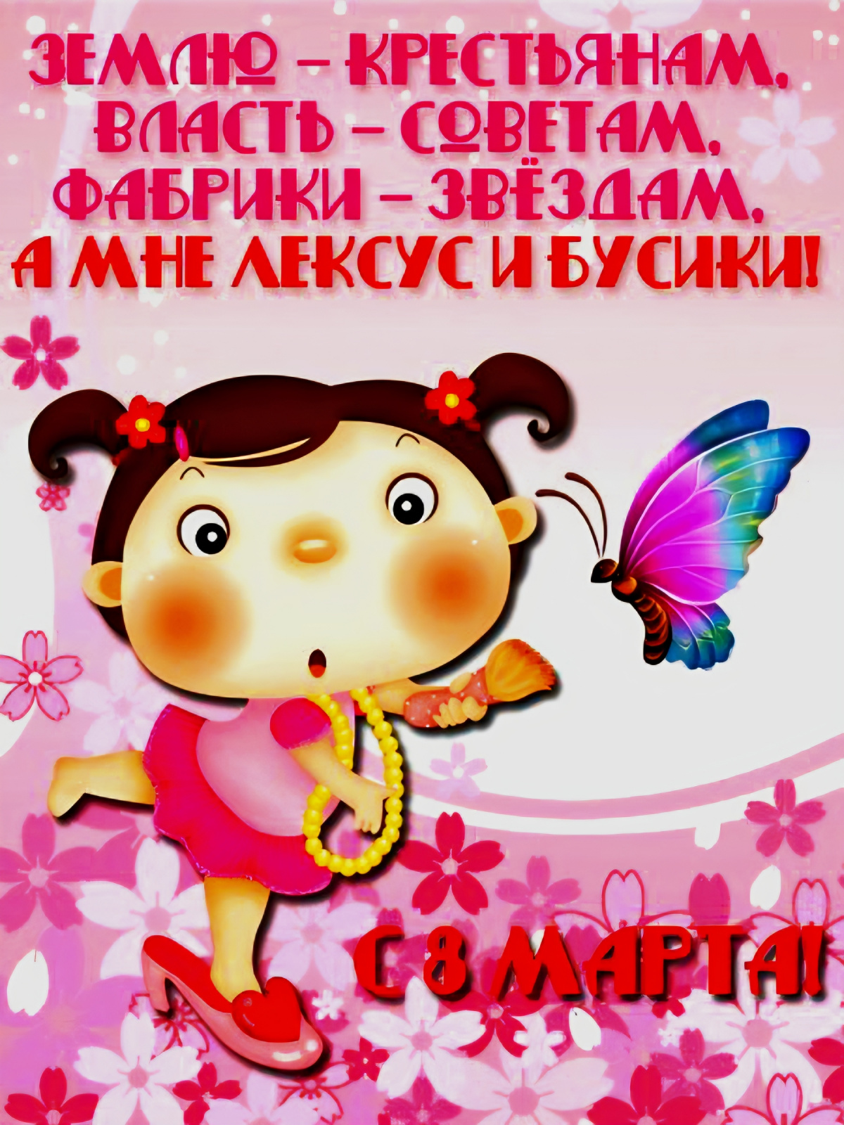 Дорогие девчата, с праздником, с чудесным весенним днём 8 Марта! Пусть у всех будет хорошее настроение, отличная погода, солнышко, желание радоваться и радовать окружающих! Ну и конечно цветы, пусть даже маленький букетик!