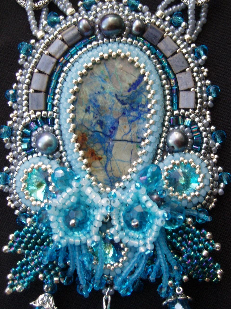 Работу делала по заказу для девушки — очень симпатичной, ей надо было что-то под цвет ее голубых глах и для обретения спокойствия. Вот мой кулончик ей очень хорошо для этих целей подошел.