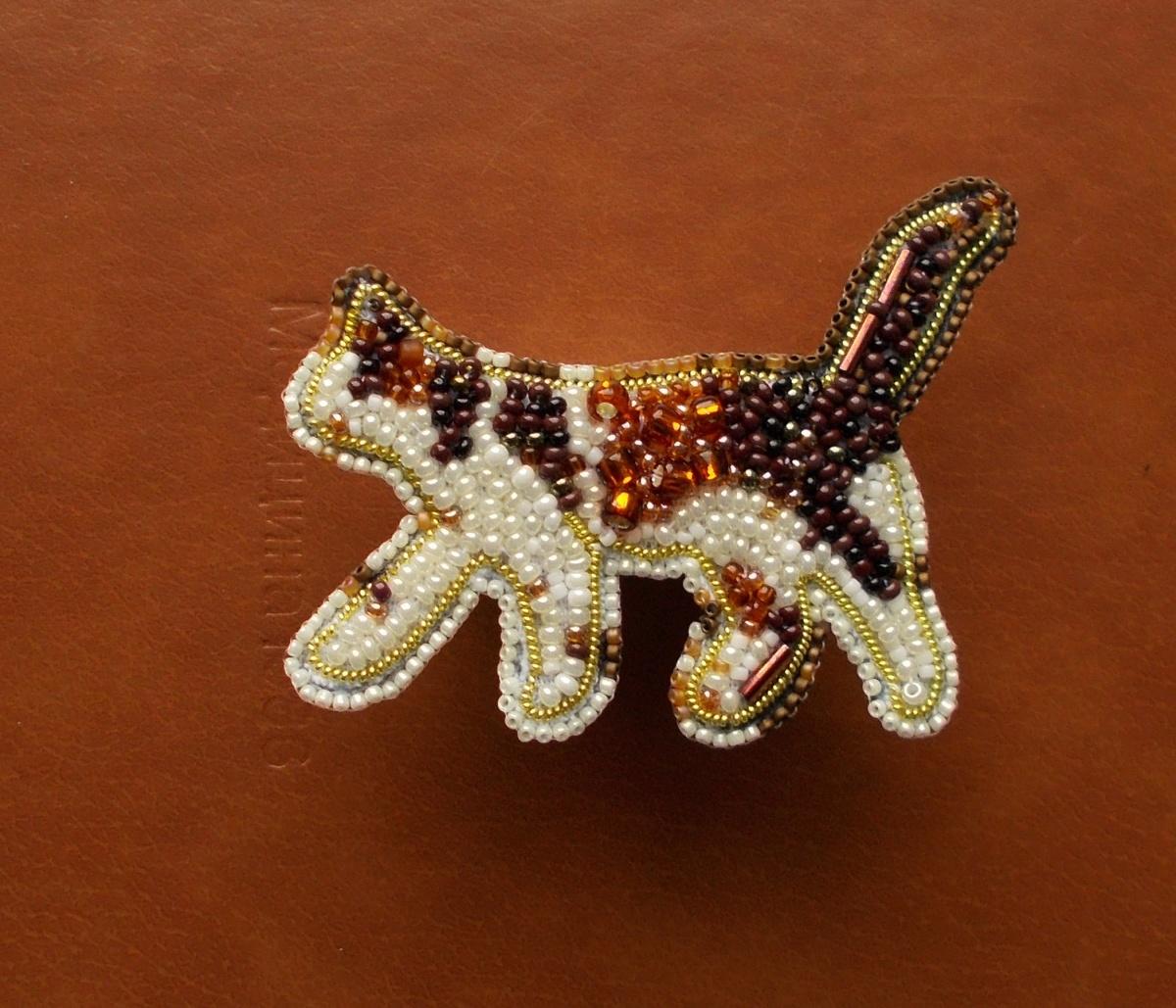 Всем известно, что кошки по одной практически не водятся. Принимайте пестренькую:заготовка с пришитой канителью золотистого цвета долго выжидала — пришить-то пришила, а цвет кошки не придумывался… Хотелось рыжую, но, при немалом количестве оранжевых оттенков бисера в хозяйстве, ничего не выбралось… Возможно, что стеклярус лишний, или нужно было его побольше брать. Но это — в следующем варианте учтем