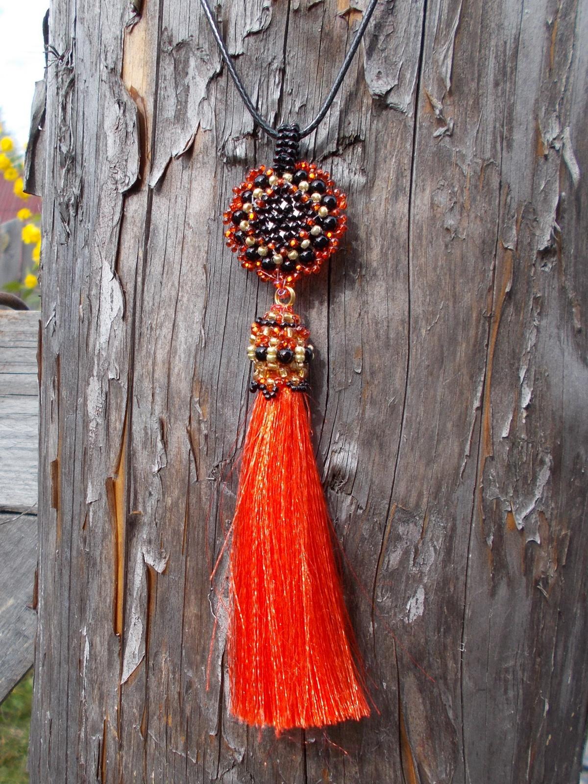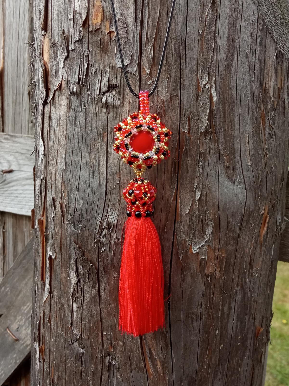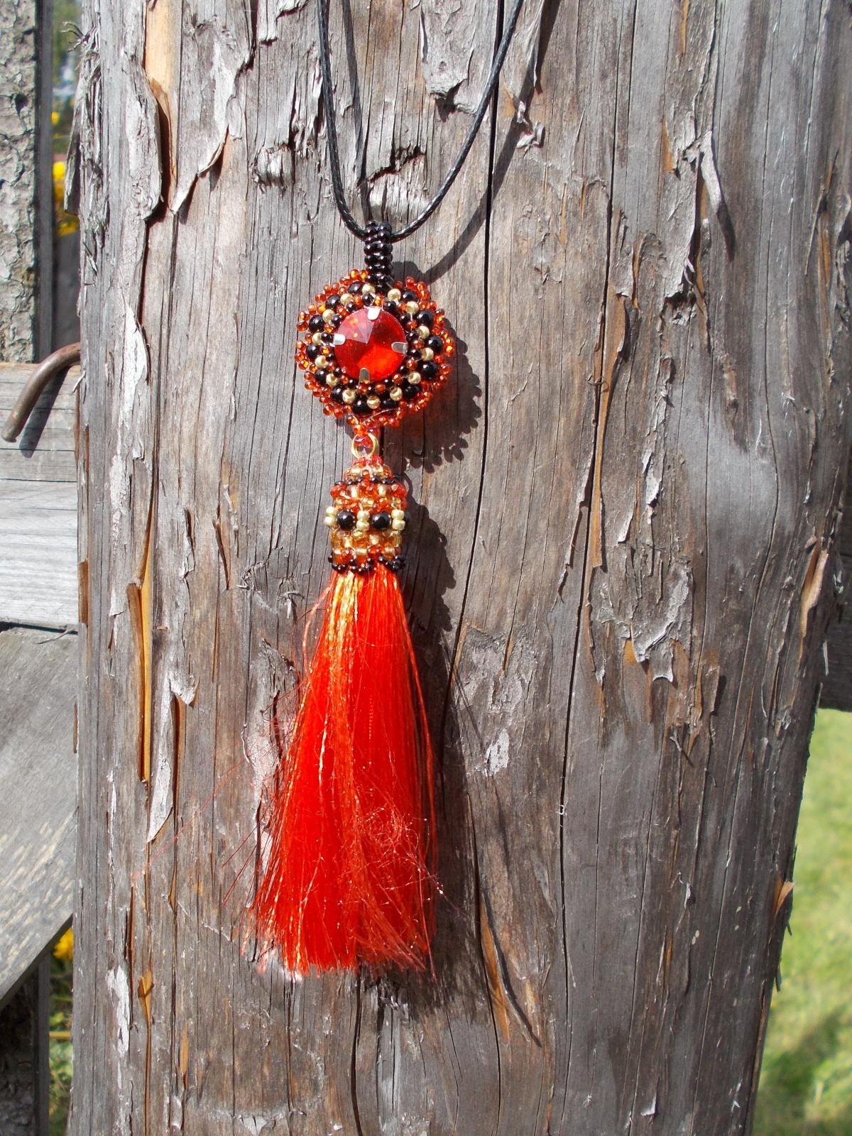 Начиналось все невинно: «а сделайте мне кулон с кисточкой для подруги, как Вы мне уже делали, только красный...». Ага, сейчас! Когда это было! И прогресс не остановить (ха, ха) — не интересно же повторяться… да и материалов тех нет… И вообще красного практически не водится в хозяйстве… ну так, по мелочи: пара хилых китайских кисточек, маленький кабошончик типа «коралл», несколько бусин и пакетик биконусов. С цветами определились: красный, в отделку черный и золото. Поехали.