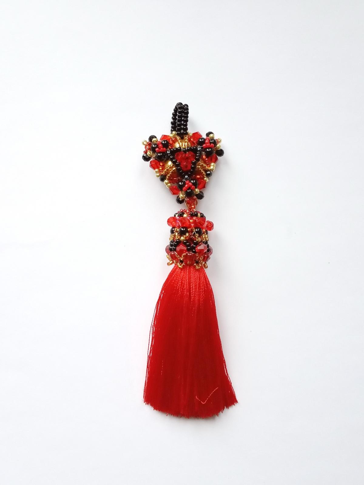 Была еще одна кисточка: тоже с оплетенным кристаллом в оправе. Тоже крестиком плюс расшивка. Цвета поменяла. Кристаллов красных минимум.
