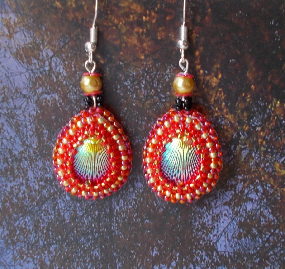 На старой работе нашлась хозяйка первому кулону с кисточкой, вышитому. Условие — с сережками. ТЗ простое — в тех же цветах, швензы белого металла, бюджет скромный, и красная бусина, как в колечке, мне подходит.