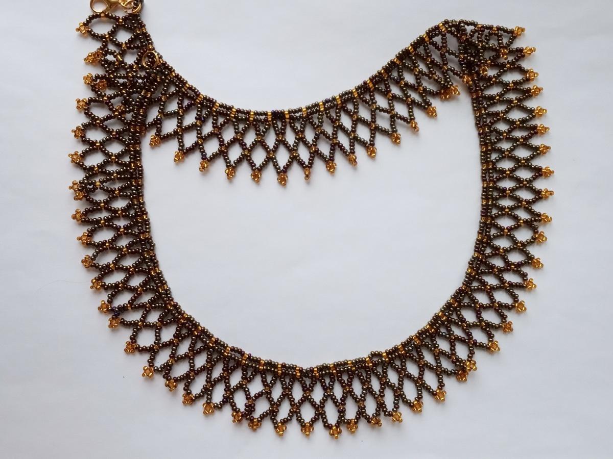 Колье по схеме из ИНЕТа. Схема вроде бы простая, но процесс и итог не понравился: при плетении нужно было фиксировать нить при каждом повороте, иначе полотно растягивалось и нить торчала безобразно. Верхний ряд получился хлипким — подплела еще бисерин: в результате верх лег некрасиво. Скорее всего порежу, только послушаю, что скажут мастера: что не так-то?