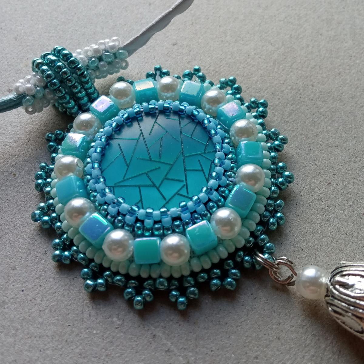 Кулон голубой, с пуговицей и кистью, пока без названия. Много фото.