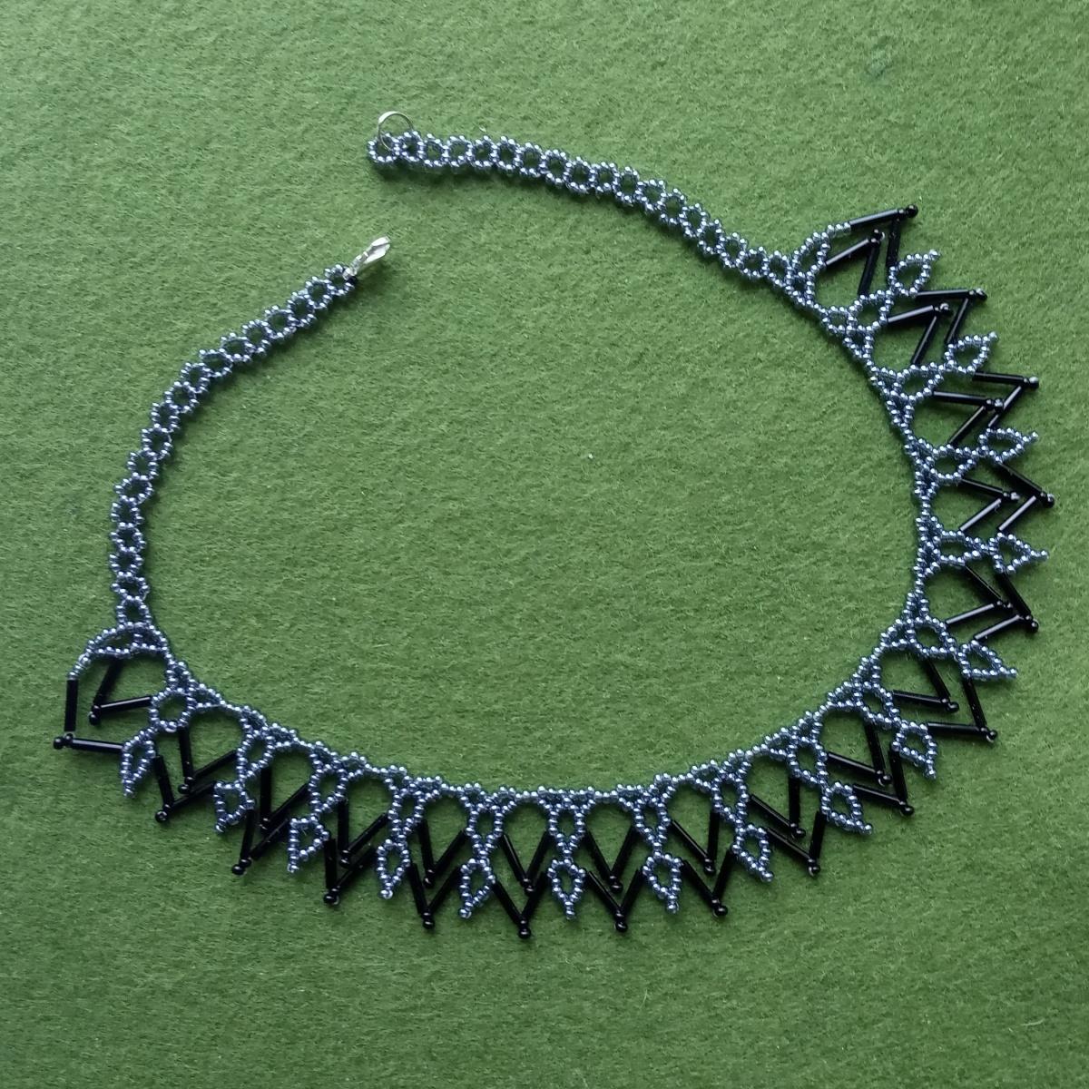 Это тоже по картинке из ИНЕТа. Плетется быстро, но ход нити заковыристый Пробовала в 2-х вариантах цветов, на шейке смотрятся хорошо. На затылочной части рисунок делать не стала — чтобы можно было удобнее с рубашкой носить.