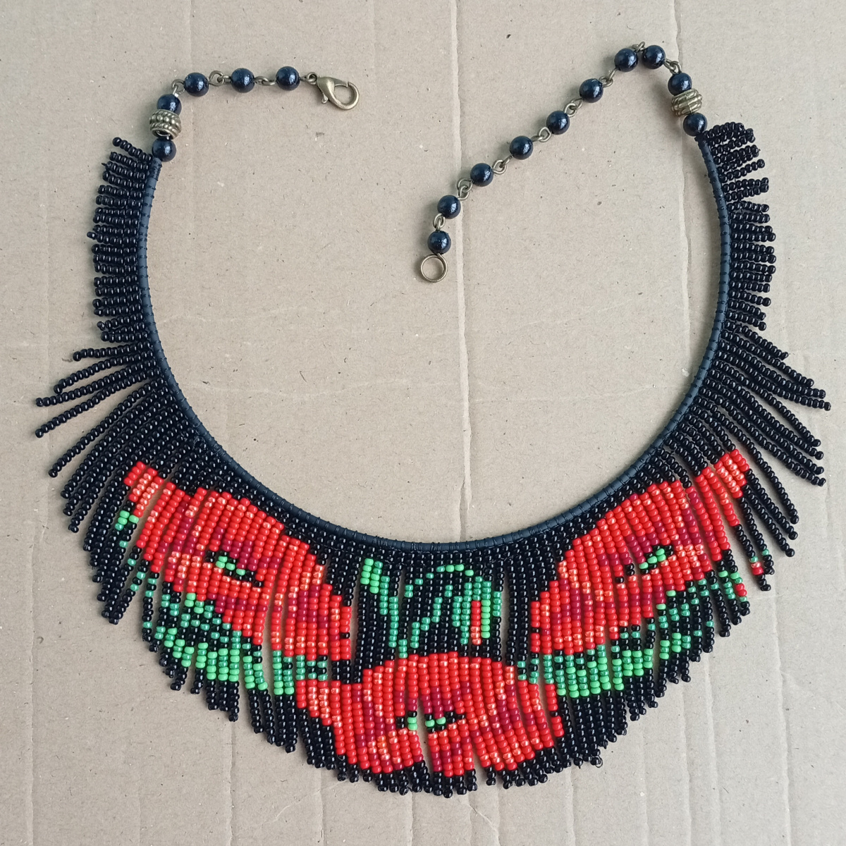 Они и по схеме приплюснуты (там на рисунке схемы сетка квадратная, а бисеринки-то не круглые, я это сразу при выборе схемы видела — они, маки, как бы «вид сбоку») и за счет мемори изгибаются. Но, если как чокер плотно надеть (не как колье, а горизонтально расположить проволоку), то естественнее смотрится. Но мне такая конструкция нравится и в работе и как форму держит Спасибо!