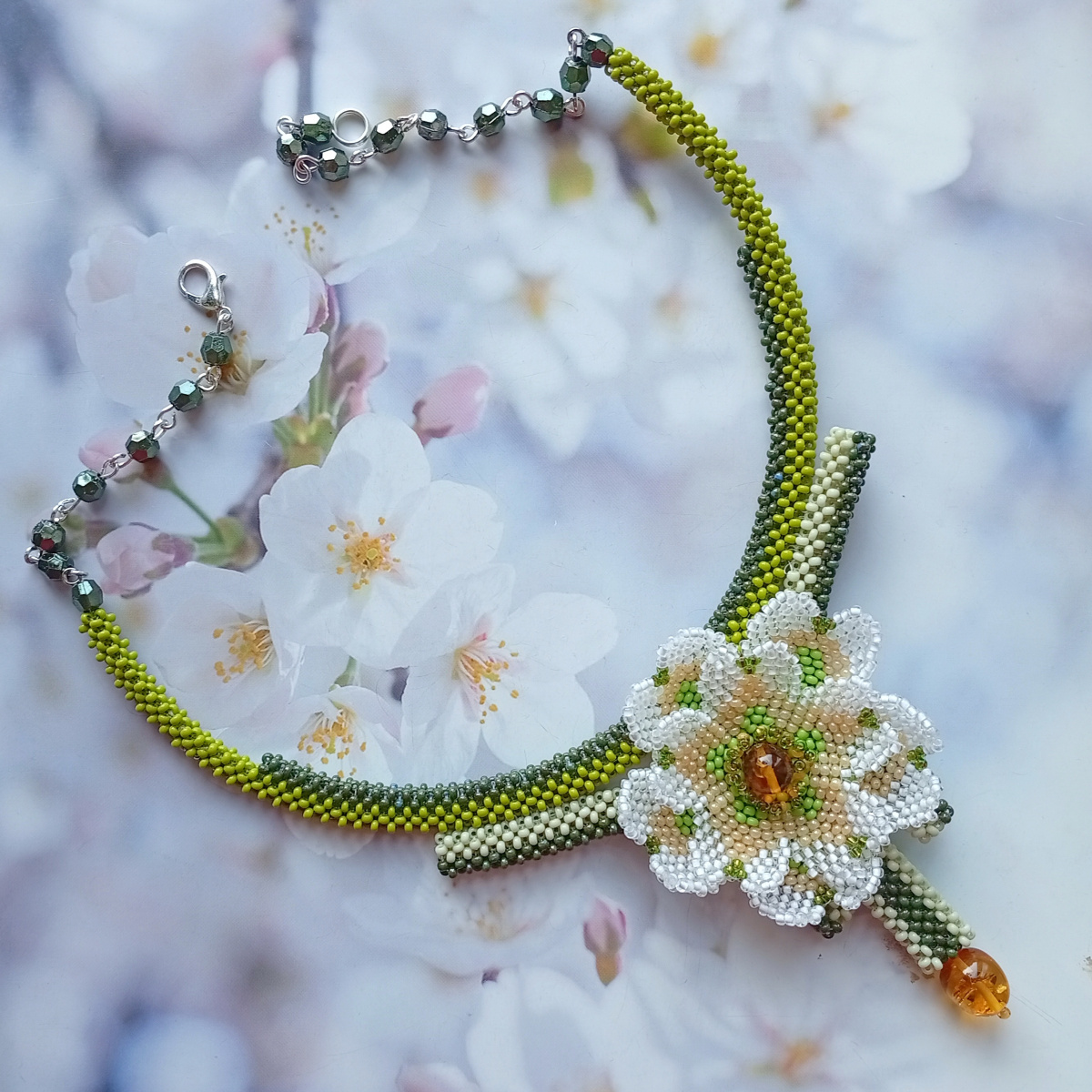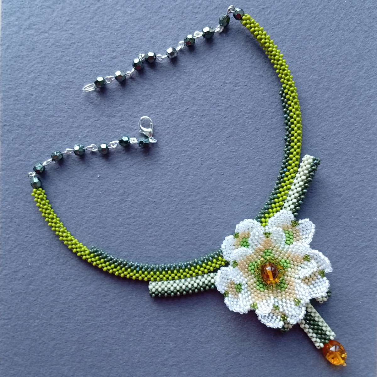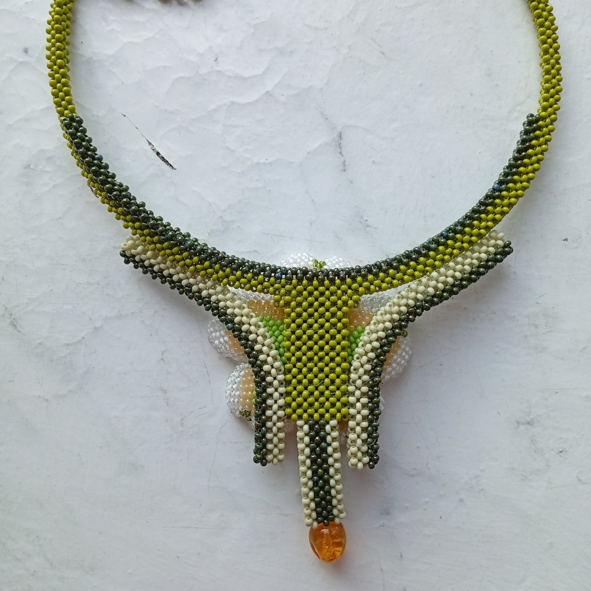 Колье «Янтарные сны» по образцу и подобию колье «Середина лета» Tamar . С разрешения автора. За мотивацию и консультации — отдельное спасибо!Первый цветок. даже пару, сделала на нити (позже покажу) полиарт 80, но резать пожалела и повторила уже для колье на мононити.