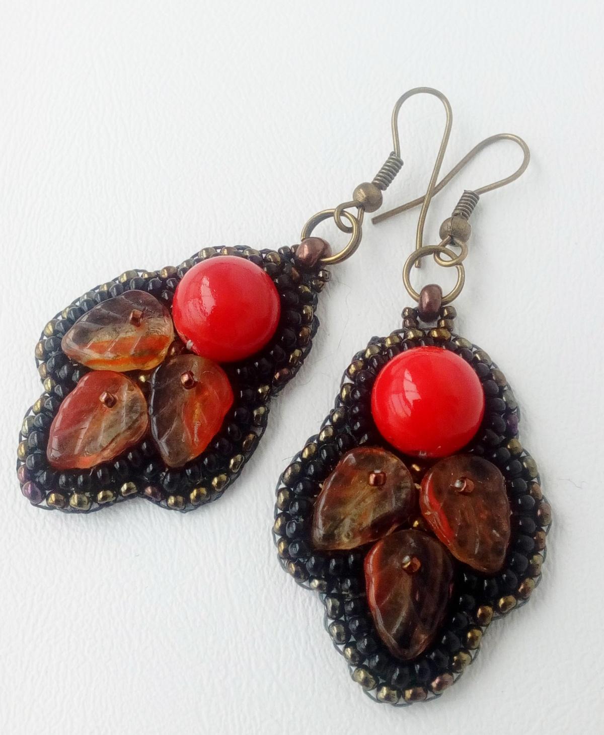 Однажды увидела в и-нете рябиновое колье великолепной мастерицы Ольги Орловой, влюбилась в него и хотела сделать что-то подобное. Бусинки для ягодок были в наличии, были и небольшие сердоликовые овальчики для листиков, но в недостаточном количестве. Всё собиралась докупить, но так и не собралась. А недавно перебирала свои «богатства» и нашла стеклянные листики, приобретенные давным-давно. И сразу всё сложилось…