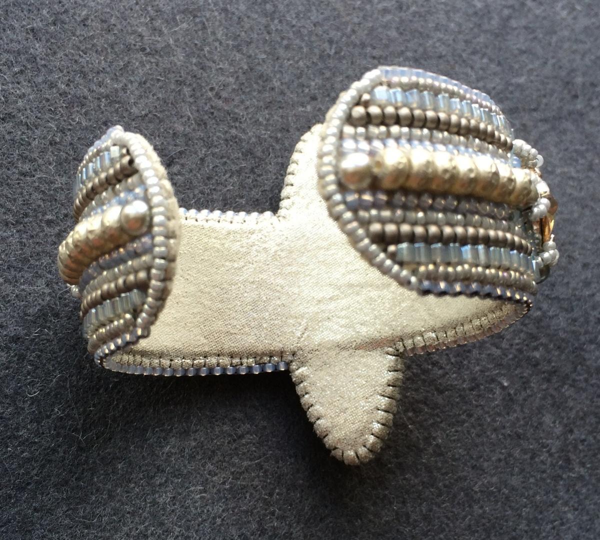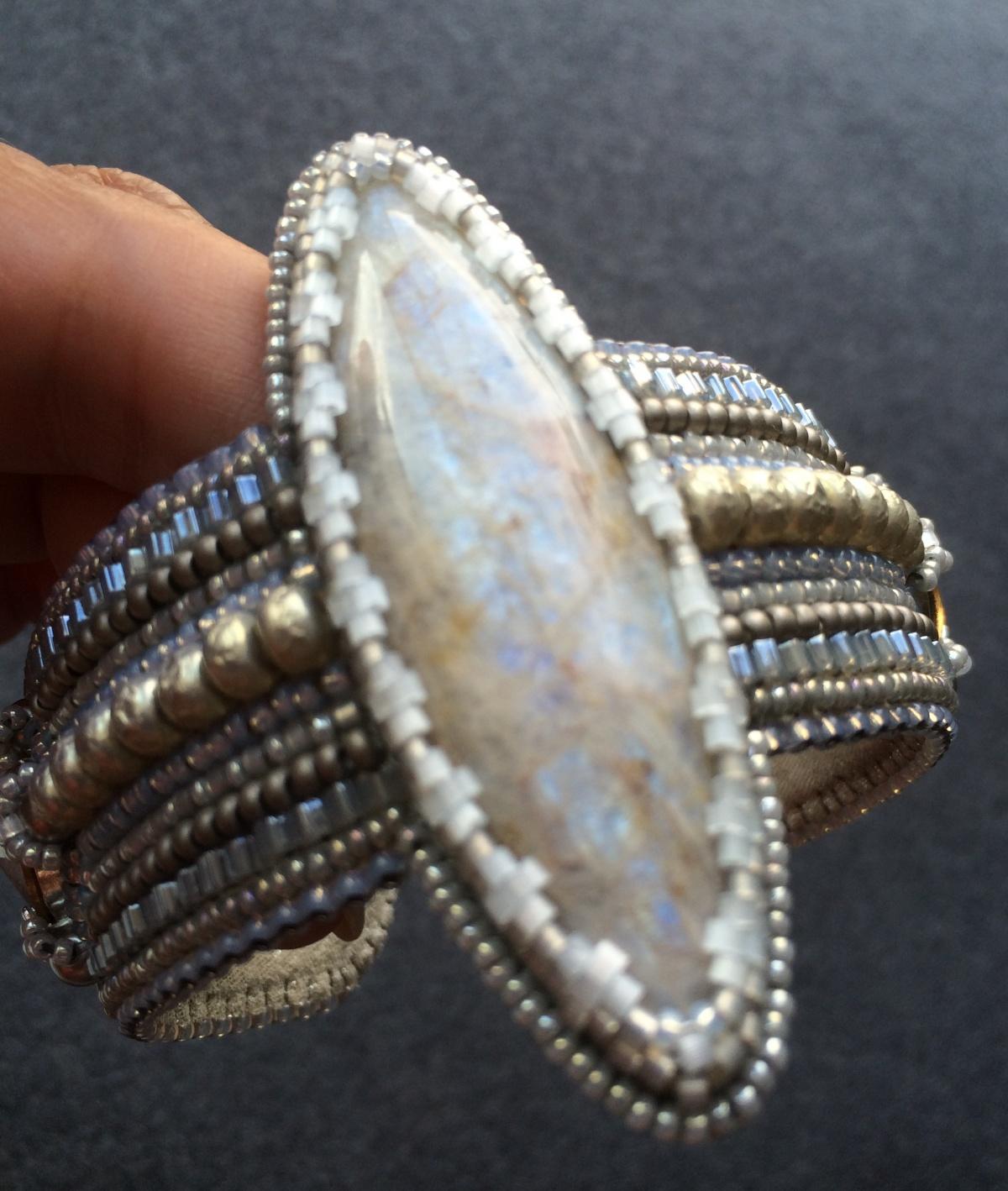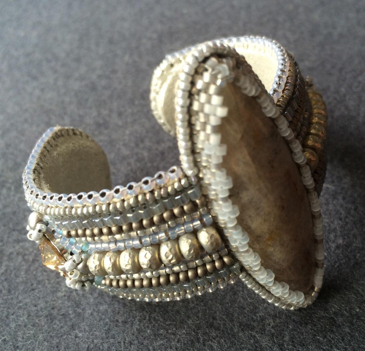 Вначале просто было желание сделать браслет, узкий, строгий, с камнем такой формы (она, оказывается, «маркиз» называется). Еще хотелось, чтоб неяркий такой был, неопределенно-призрачного цвета, без яркого блеска, но с золотистым отсветом, именно с золотистым, а не золотым. Поэтому бисер весь либо матовый либо опаловый с золотым прокрасом. Блестят только ривольки и рядки гексагенов, с этого, собственно, и началась череда компромиссов: не нашлось опаловых риволек нужного цвета и нужного цвета бисера, пришлось поставить гексы, но, в их оправдание, скажу, что они опаловые. В первый раз использовала давно заказанные бусины, у них такая интересная «жатая» поверхность, в моем представлении дает «старинность».