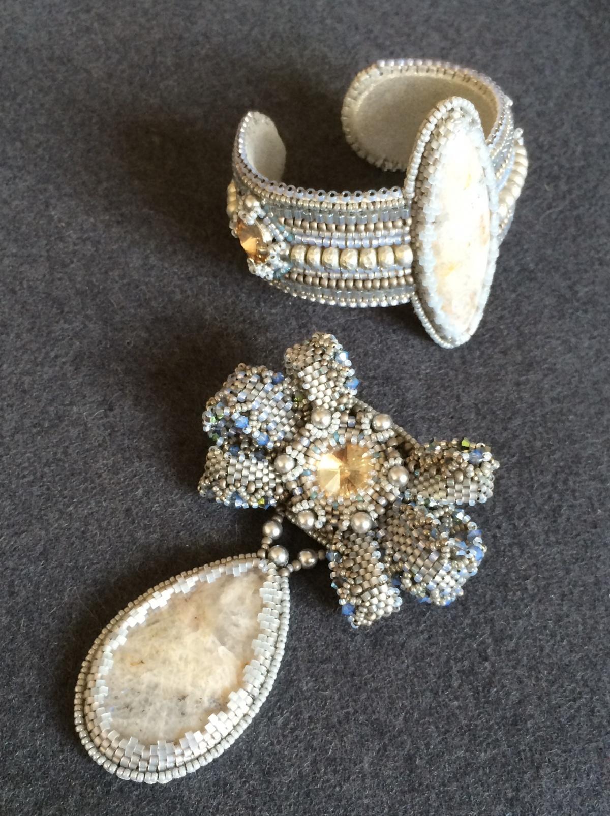Камушек замечательный, наигралась им, пока вышивала, очень хорошая ирризация, ярко-голубой отсвет.После того, как браслет был вышит, последовала просьба «сделать что-нибудь на шею». Подумалось, что брошь по дизайну Алены будет сюда кстати. Сделать нечто плетенное для меня — подвиг.