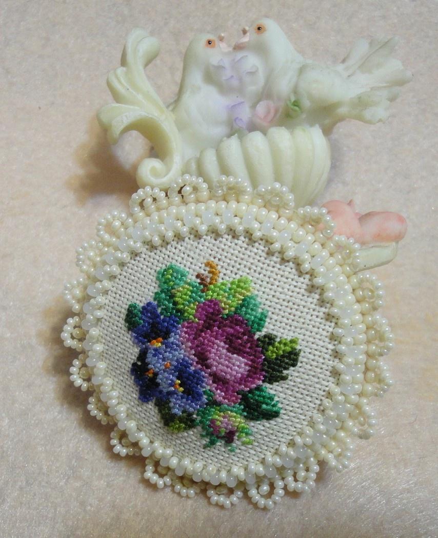 Старинный сюжет — опять) Я Вышила его бисером — зеркальце, микровышивкой петит-поинт — на черной основе в бронзово-золотой рамке бисером под старину — в викторианском стиле, и в нежных молочно-сливочных тонах — очень вкусно) — в кружевах — в стиле шебби-штк! Вот. Получилось три вещи — зеркальце, оно отдельно, и две броши — двойняшки, но не близнецы))) На черном сама вышивка чуть крупнее, чем на светлом — светлая на 32м каунте.