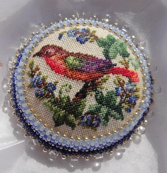 Брошь ок 6см.Микровышивка, петит-поинт на 32к. Бисерное обрамление — чех,15шка Тохо и дропсы-капельки.