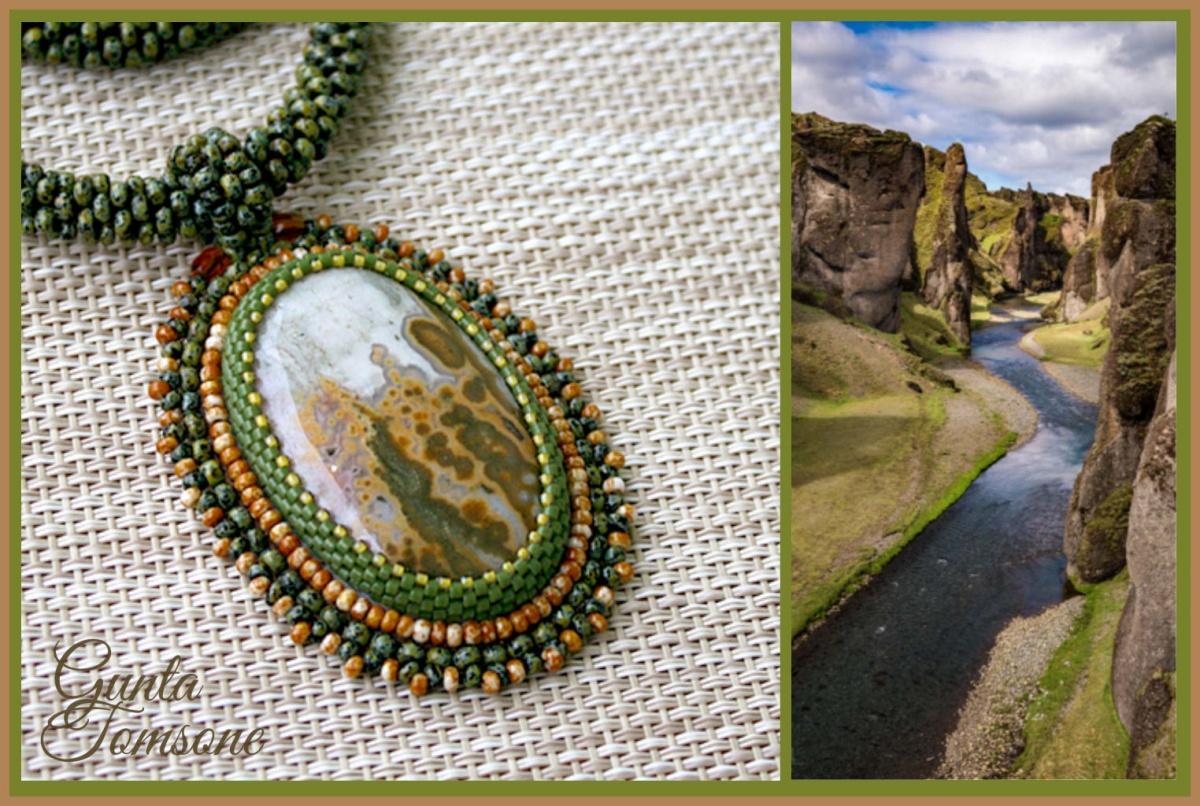 Потрясающий кабашон яшмы- сразу увидела в нем каньон, и даже нашла какой-Fjaðrárgljúfur каньон в Исландии. Увы- не прочитать, не выговорить я это не могу, только вышить, поэтому- лето в Исландии.