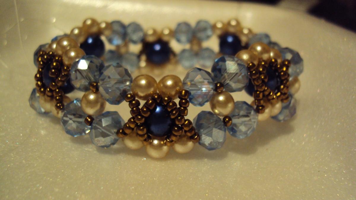 Это мозаика 3 или 4 бисерины + 1 биконус. Первый ряд так и набирается, второй — проходим иглой через биконусы и плетём только биконусы, третий ряд — по 3 или 4 бисерины, проходим через биконусы, четвёртый ряд приплетается к первому и плетётся по 3 или 4 бисерины через биконусы. 5 и 6-ой ряды приплетаем соответственно к 4-ому и 3-ему рядам — плетём 1бисерина 1 биконус 1 бисерина через 1 или 2 бисерины предыдущего ряда, по принципу сетки. Ну и дальше уже импровизирую, как ложится материал смотрю. Золотой браслет по такому же принципу плела, тот что чисто золотой, без биконусов голубых.