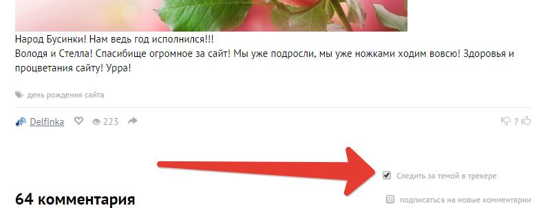Если вы оставляете в какой-то записи комментарий, то в Трекер автоматически добавляется подписка на новые комментарии. Если же вы просто хотите следить за дискуссией, то выберите галочку "Следить за темой в трекере", и она добавится к вам в трекер.