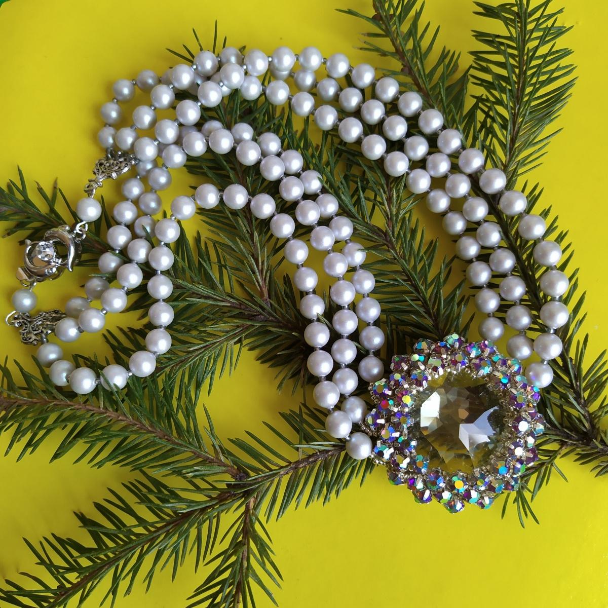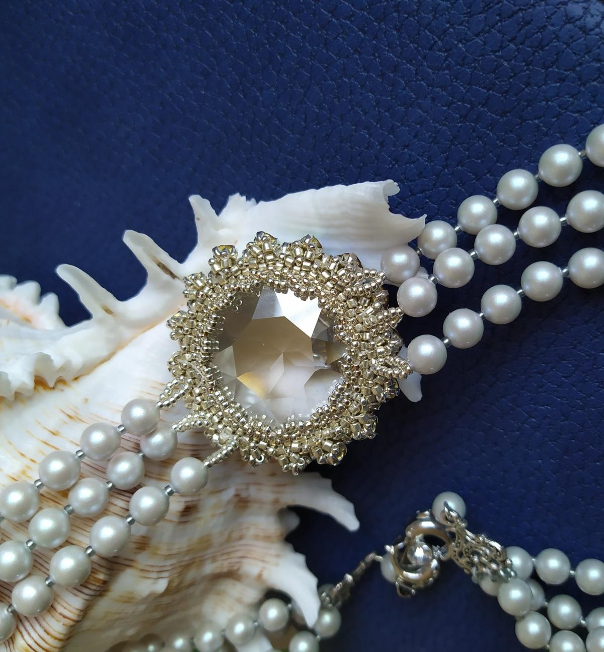 На инсте Катя Колесникова @koleskath поделилась с желающими МК колье «Леди Ди». Конечно, я была в числе желающих, тем более как раз большой страз Сваровски лежал без дела уже давно. Вот под занавес и решила сделать лично для себя богатый чокер. Заказала жемчуг Сваровски (там его должно быть 5 нитей), даже файрлайн купила для него (ох и понравилось мне с ним работать!). В приличную сумму вылилось. Но не нашла подходящих коннекторов. У меня нашлись только на 3 нити. Пришлось этим и ограничиться.