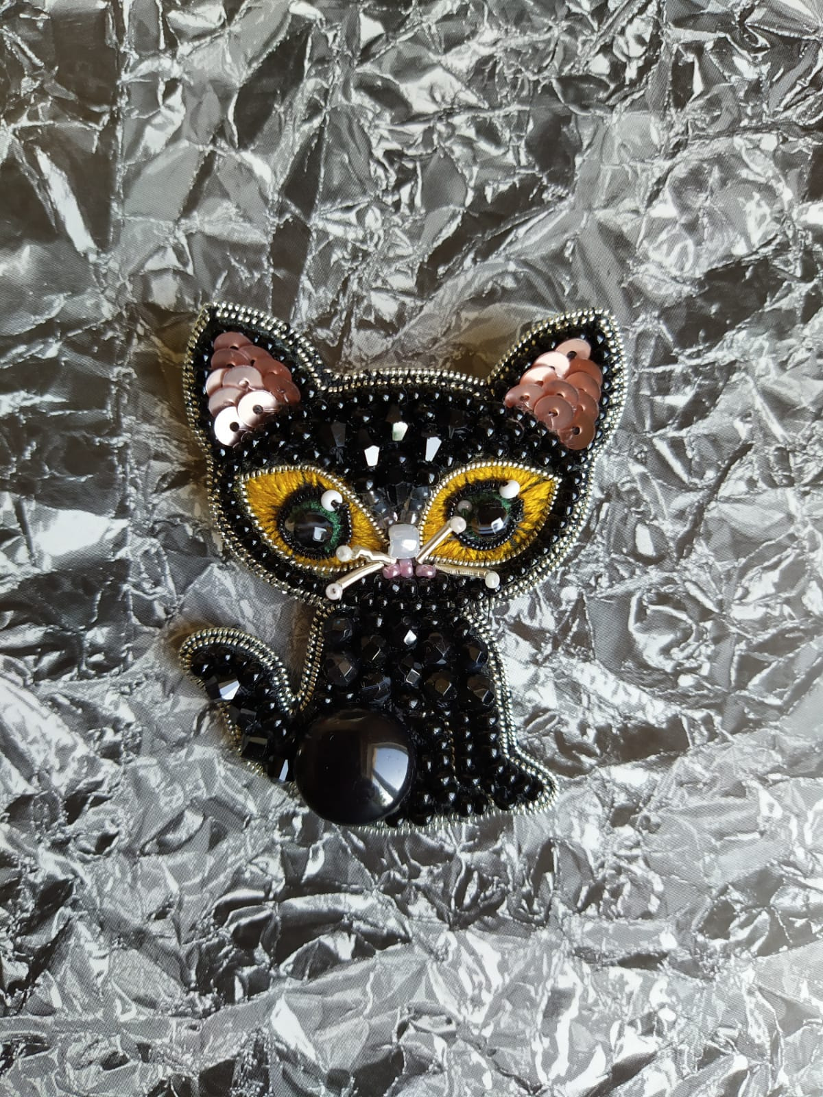 Просидела я с таким простым котиком почти неделю. Шила и перешивала. Но больше всего досаждало то, что ничего не вижу. Меняю одни очки на другие, затем на третьи. А потом всё расплывается. То ли из-за того, что на чёрном, то ли ещё чего. Вроде не так давно, осенью проверяла зрение. Всё было в относительном порядке. А теперь хоть бросай бисер. Жалко. На бусы что ли перейти?