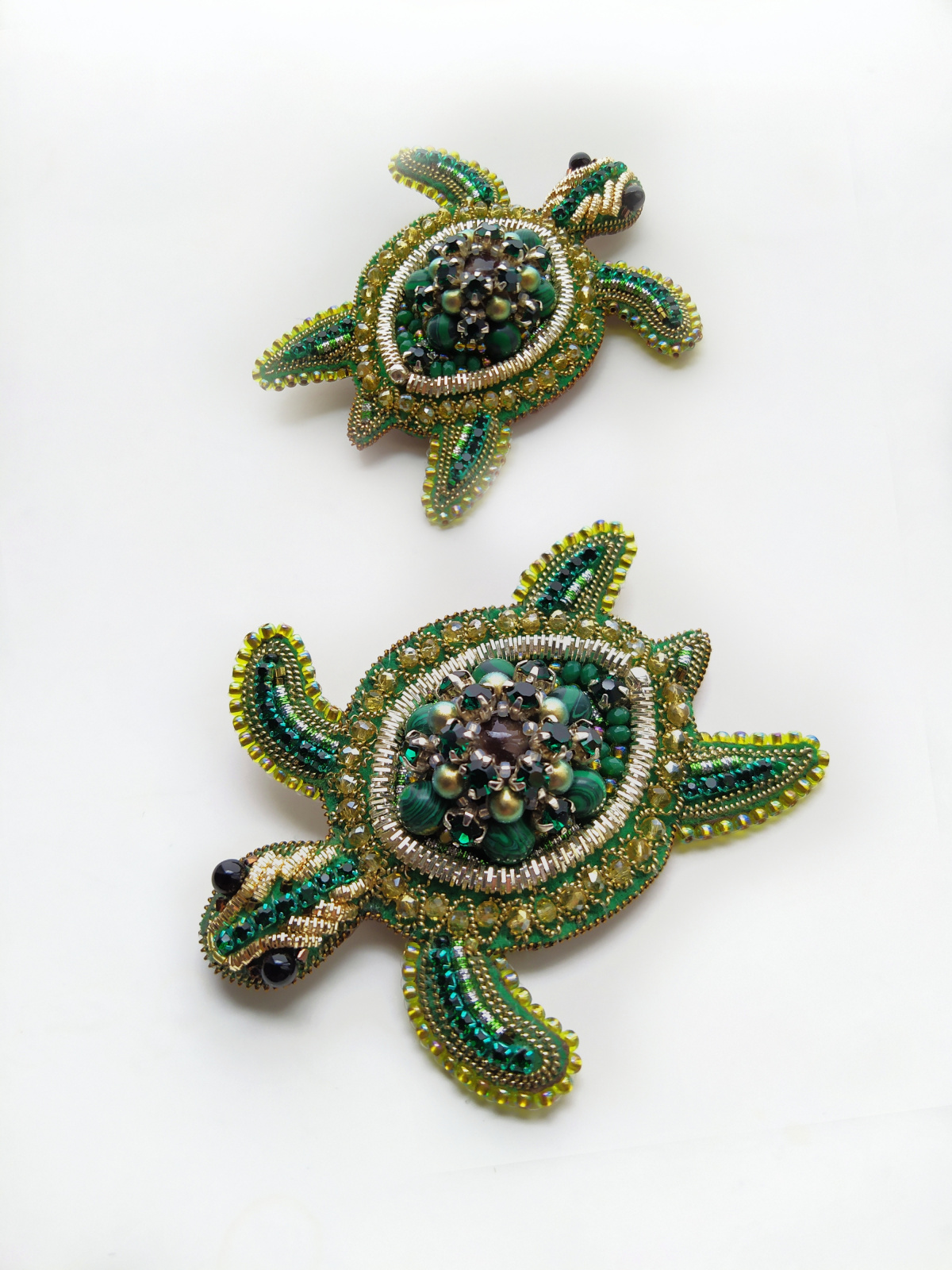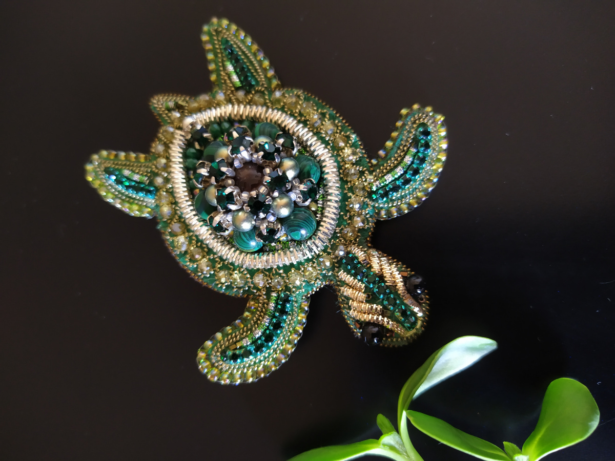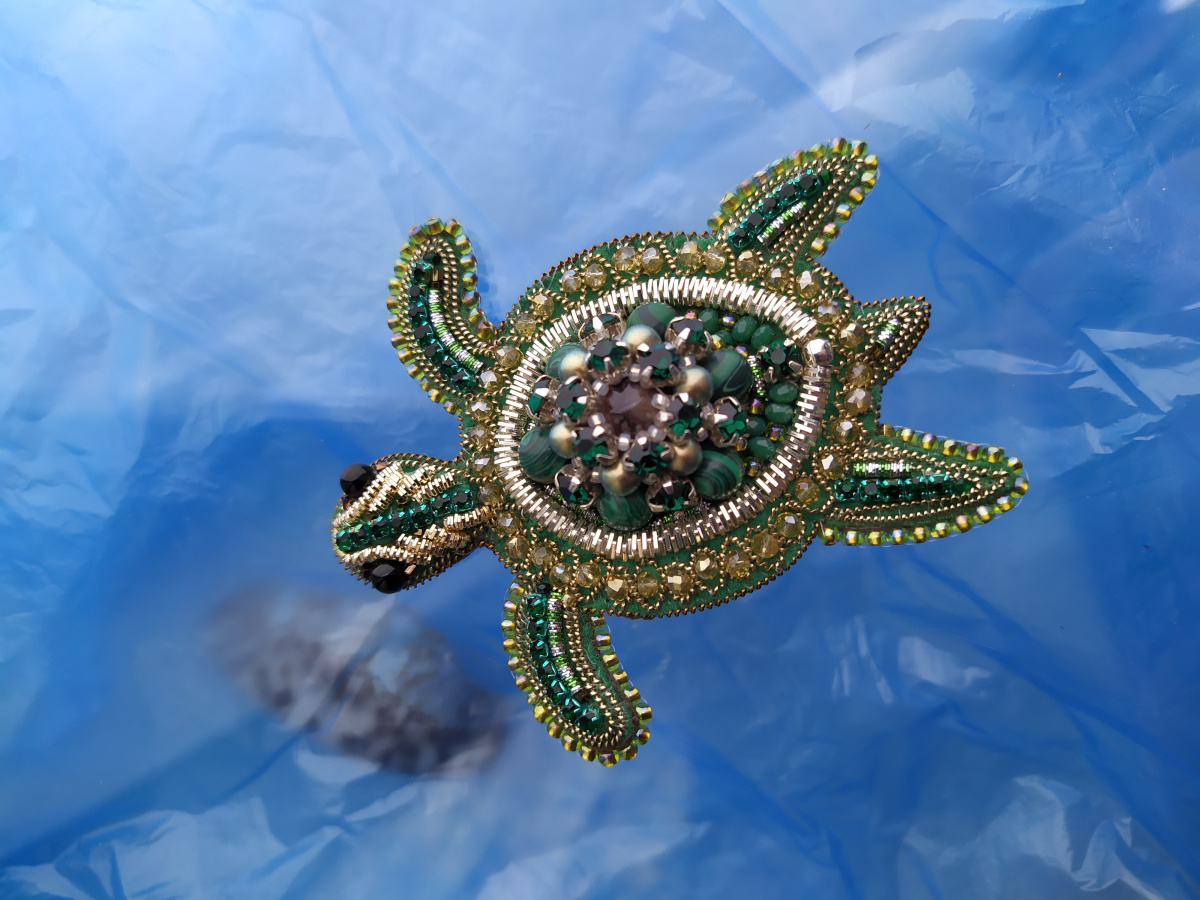 Долго у меня лежала эта плетёная верхняя часть из самых лучших бусин. Никуда не могла пристроить. А вот в черепашку хорошо легла. Получилась довольно высокой, поэтому сложно поймать фокус