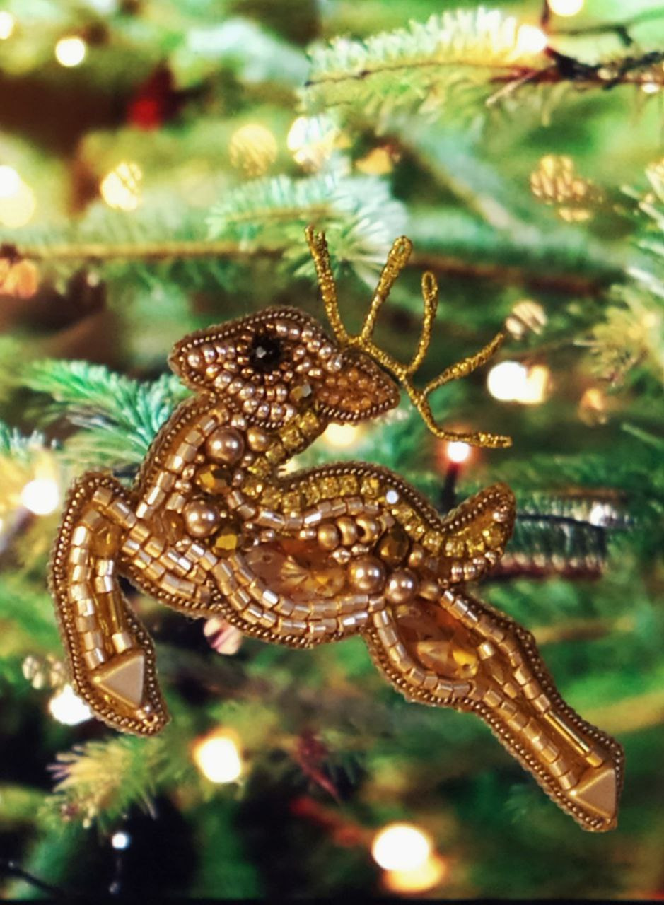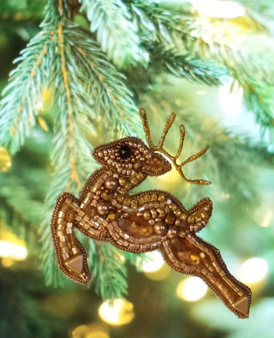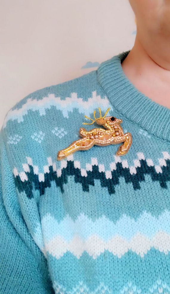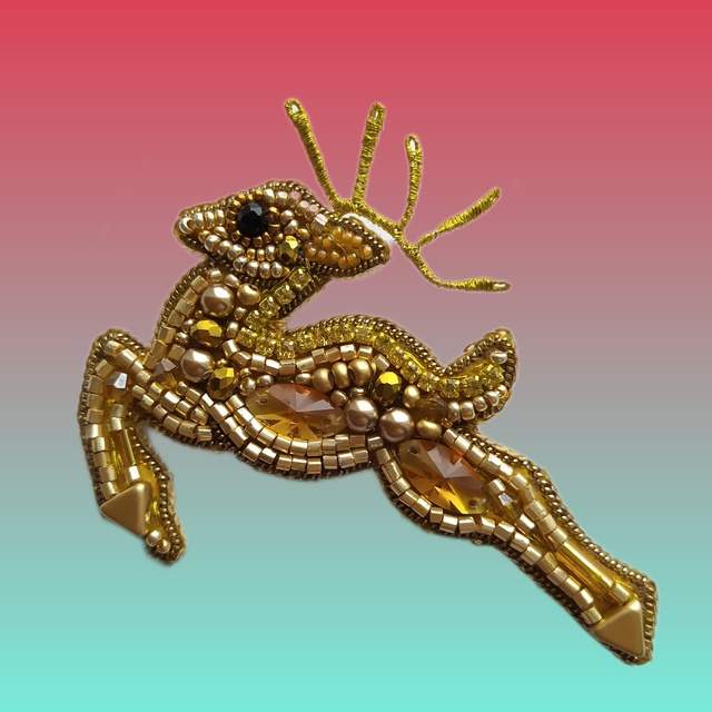Брошь размерами 7 х 5,5 см, вышита бусинами, бисером, стразами, канителью, пайетками — и чего там только не было!