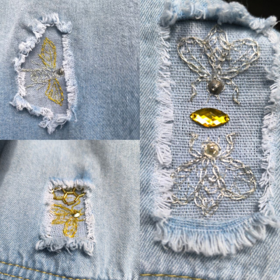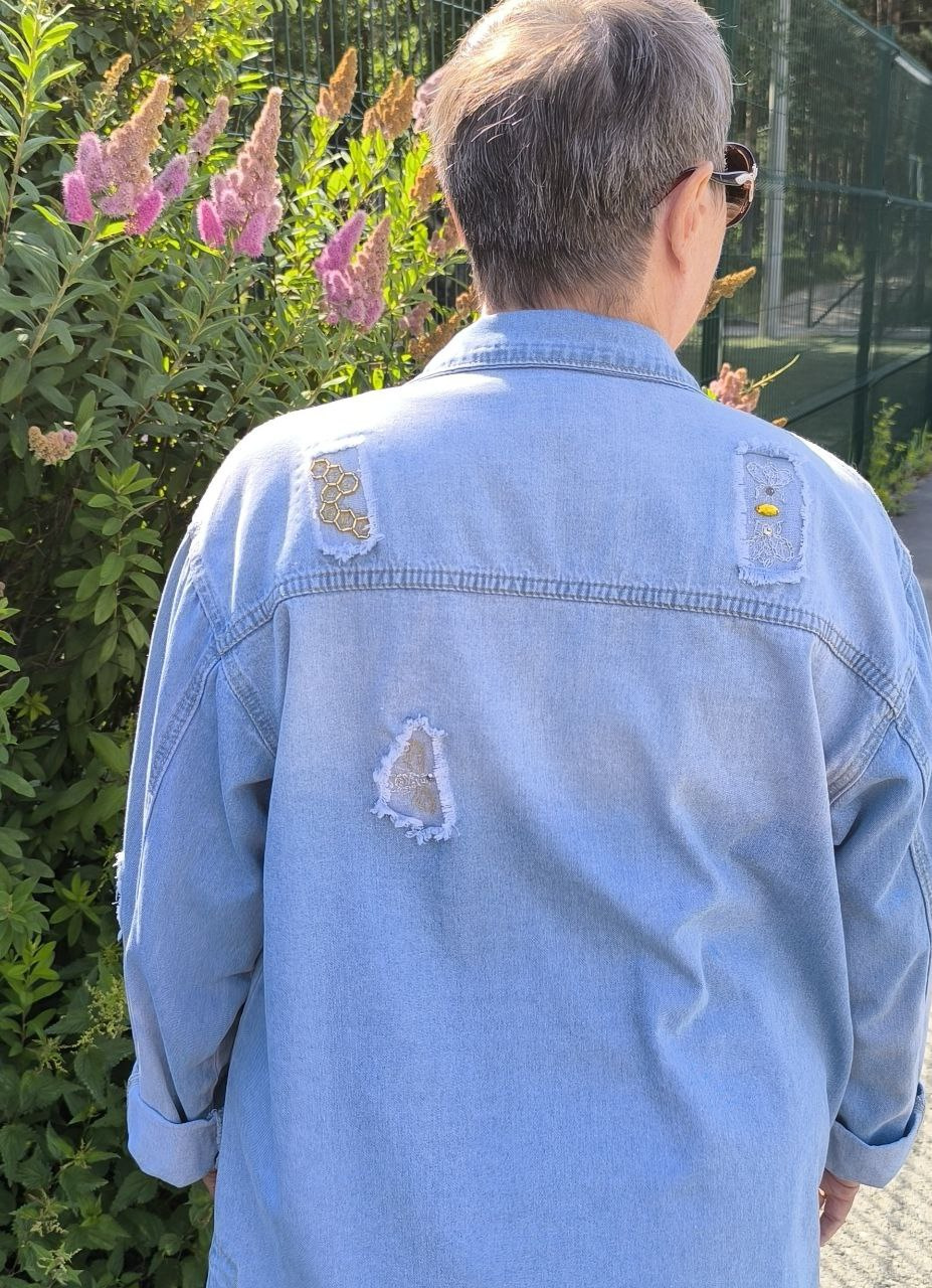 И вот я обрезала все эти лохмотья, вышила 9 накладок и вставила их на места этих дыр. Все в одной тематике — пчёлы и соты. Выравняла и низ, обрезав лохмотья, которые там свисали, как будто меня собаки рвали. И душа моя успокоилась. Теперь я с удовольствием сама надеваю и муж рядом идёт довольный.