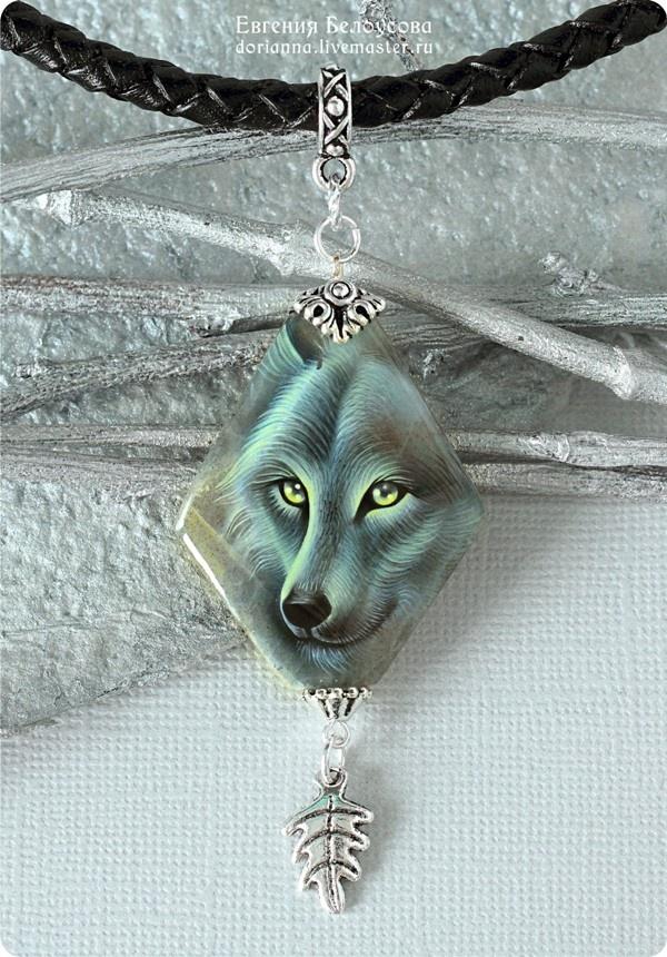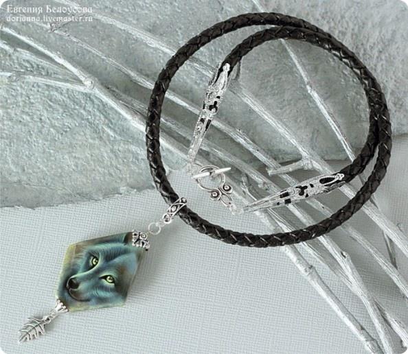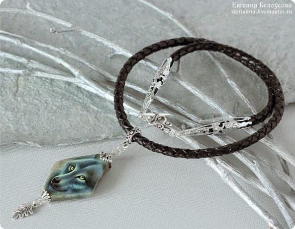 Роспись на лабрадорите, шнур из натуральной кожи, посеребренная фурнитура.