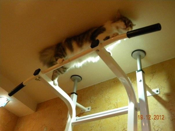 Отобрал в личное свое пользование нашу шведскую стенку, теперь никто на нее не лазит — этот товарищ боксировать сверху начинает и грозно мяукать!!!