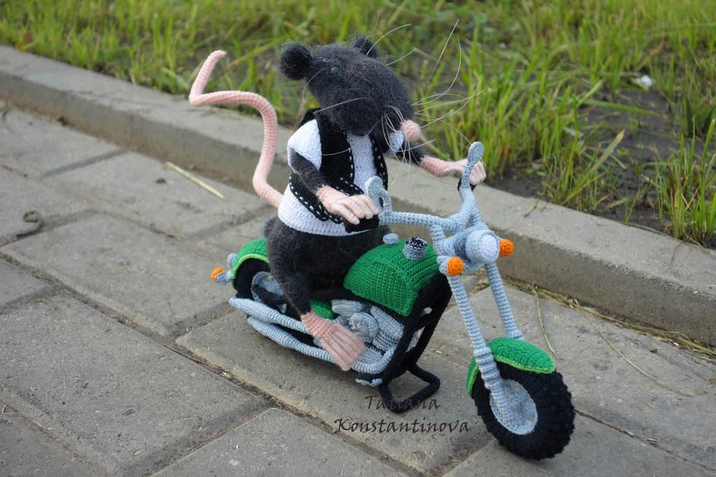 От знакомой получила интересный заказ. Говорит мне: «Свяжи крыса байкера, а мотоцикл можно будет игрушечный ему подобрать в детском магазине». Ну я же рукодельница, легких путей не ищу. В результате сначала связался мотоцикл, а к нему уже крыс байкер.