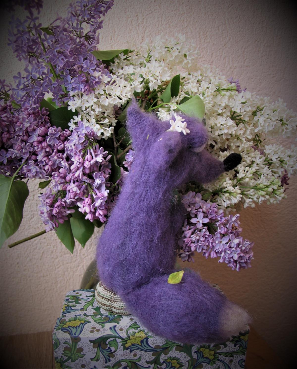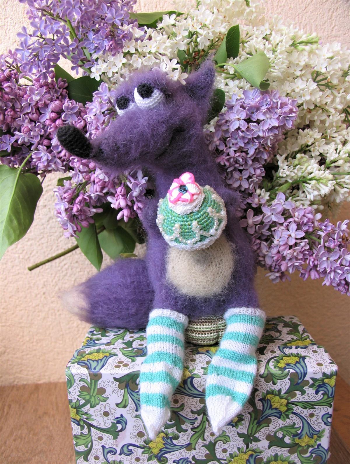 Всем привет! На этот раз Лис получился сиреневый. Спросите почему? Да все очень просто, Лис побывал в стране чудес у Алисы, был представлен сиреневой гусенице, и так ему это цвет понравился, что заказал себе сиреневую шубку с повышенной лохматостью. Алиса угощала Лиса фисташковыми пирожными, которые ему очень понравились, и с одним он не пожелал расставаться и прихватил с собой. Вот как-то так. Связан по МК Ирины Житенёвой.