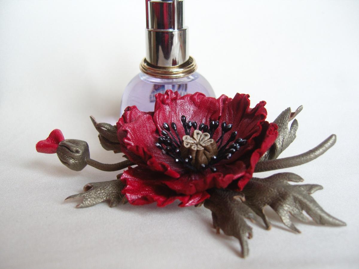Обожаю маки! Несколько сплела из бисера, бесчисленное множество фотографировала у свекрови, и вот наконец сподобилась смастерить из кожи, очень тоненькой, итальянской, с красивым перламутровым напылением.