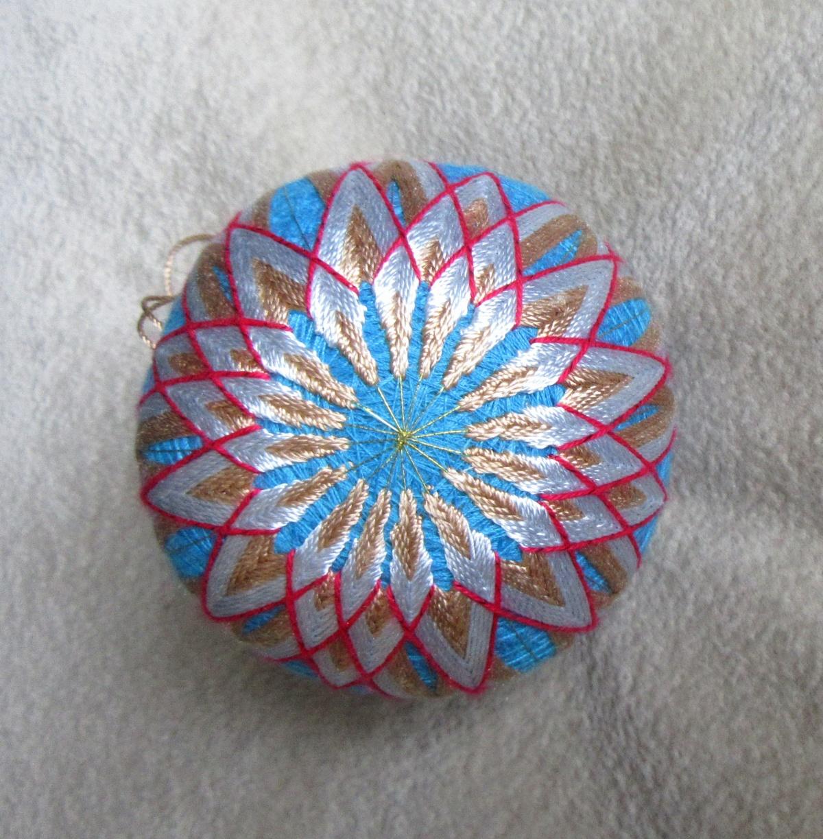 Верно. Муж у меня спросил вчера — а зачем ты их (темари) делаешь?? Для души! И как подарок хорош. Расходы и правда небольшие в темари, только нитки для вышивания. А для мари (основы) — у меня целая коробка ниток швейных, крепких и цветных, с былых времён, внутрь я вставляю сейчас теннисные шарики по 5р., а в них засыпаю остатки ненужного и бракованного бисера, пинов и т.д. для погремушек. Но главное — я на вышивке темари отдыхаю