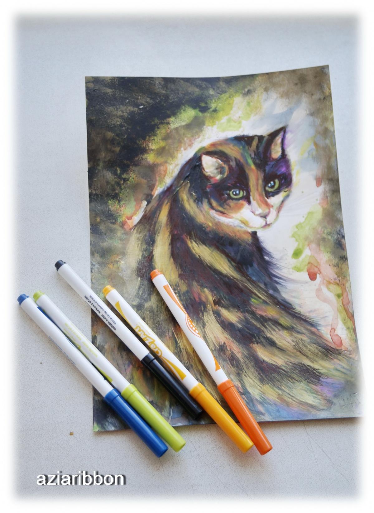 Рисовала на таком же картоне внучкиными фломастерами, которые водой смываются (ей другие нельзя — потом не отмыть ни стены, ни холодильник расписной