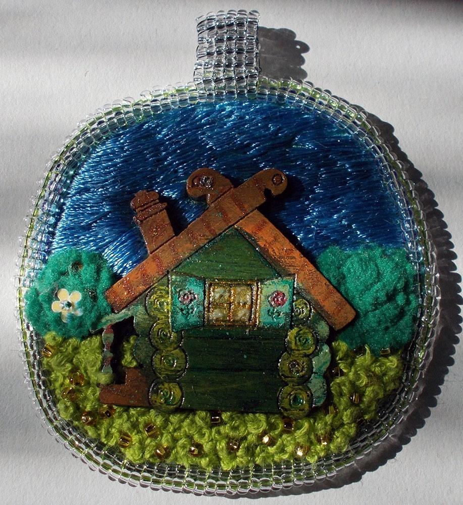 Деревянные заготовки (привезённые из Мышкина), расписаны акрилом и гелевыми ручками, на жёлтом — наклейки и эпоксидка, зелёная избушка покрыта лаком. Ещё: нитки вискозные, мулине и пряжа синельная, немного бисера и пайеток, изнанка — кожзаменитель.