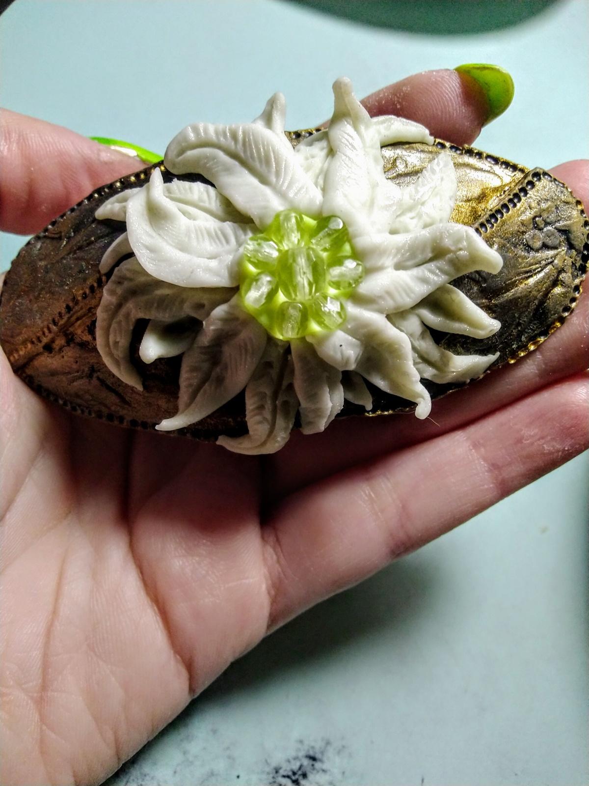 Сделала брошь — фибулу для шерстяной альпийской накидки. Так как оригинал такой найти невозможно ни за какие деньги, я взяла за образец фибулу начала 18в, хранящуюся в музее Мюнхена. Основа у оригинала сделана из тисненой позолоченной кожи, а сам цветок из слоновой кости. У меня, естественно, все светится))