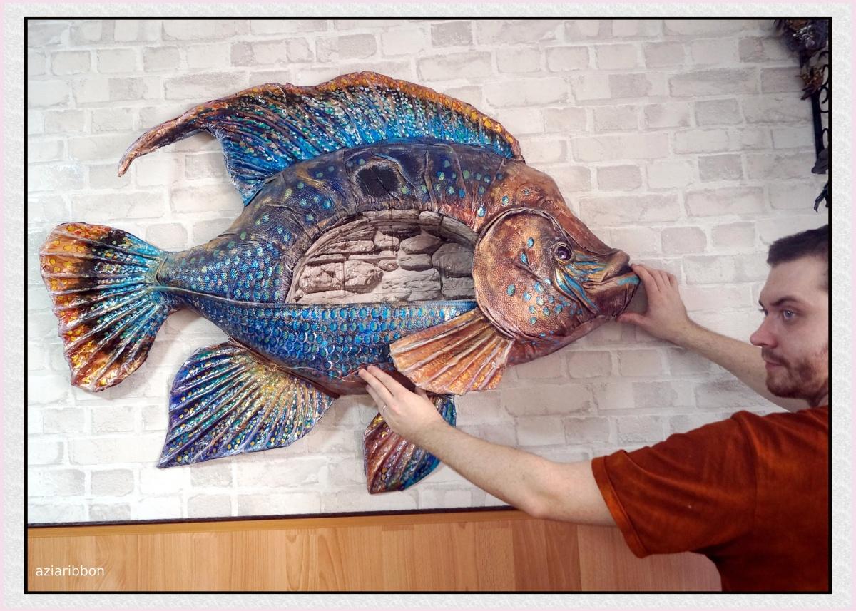 Недавно я показывала свою безумную полку-рыбу)) Она уже висит на стене, выполняя свою законную функцию — украшает и содержит в себе разные мелкие предметы, которые невозможно оставить в доступных местах для кошек. Эти бандиты всё сопрут, заиграют, погрызут, спрячут и потом не признаются, куда задевали))) Теряются таким образом ножницы, пульты, очки, карандаши и ручки, зажигалки и прочие мелочи. Теперь же они благополучно лежат в рыбьем брюхе, никем не тронутые))