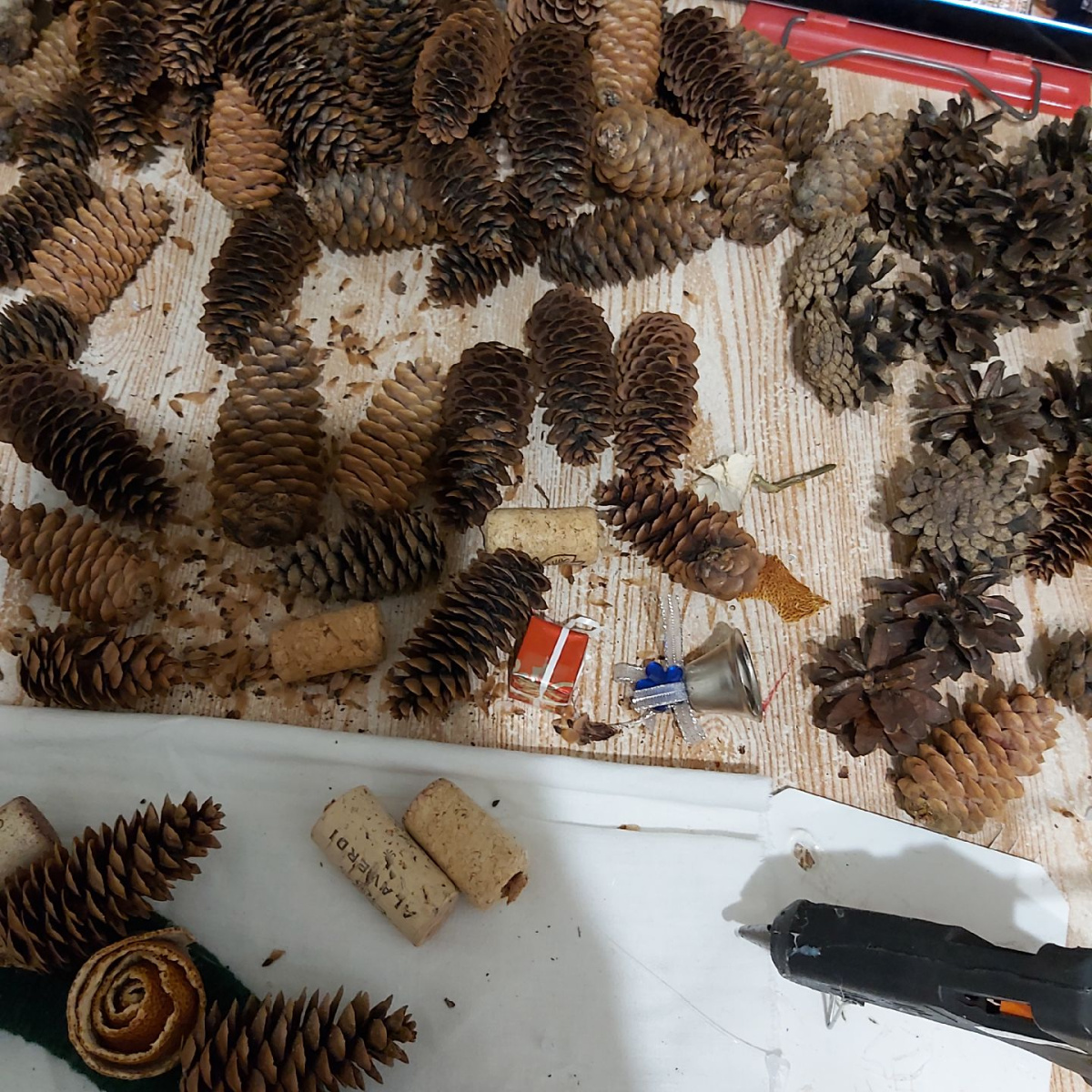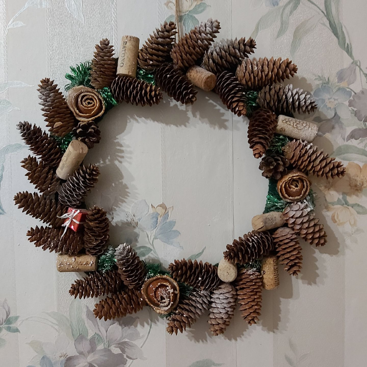 С сосновыми тоже делала венок. Ещё шар из газет и туда сосновые шишки. Красиво получилось. Но шишки не красила. Может действительно из-за краски отпали. Эти держаться.