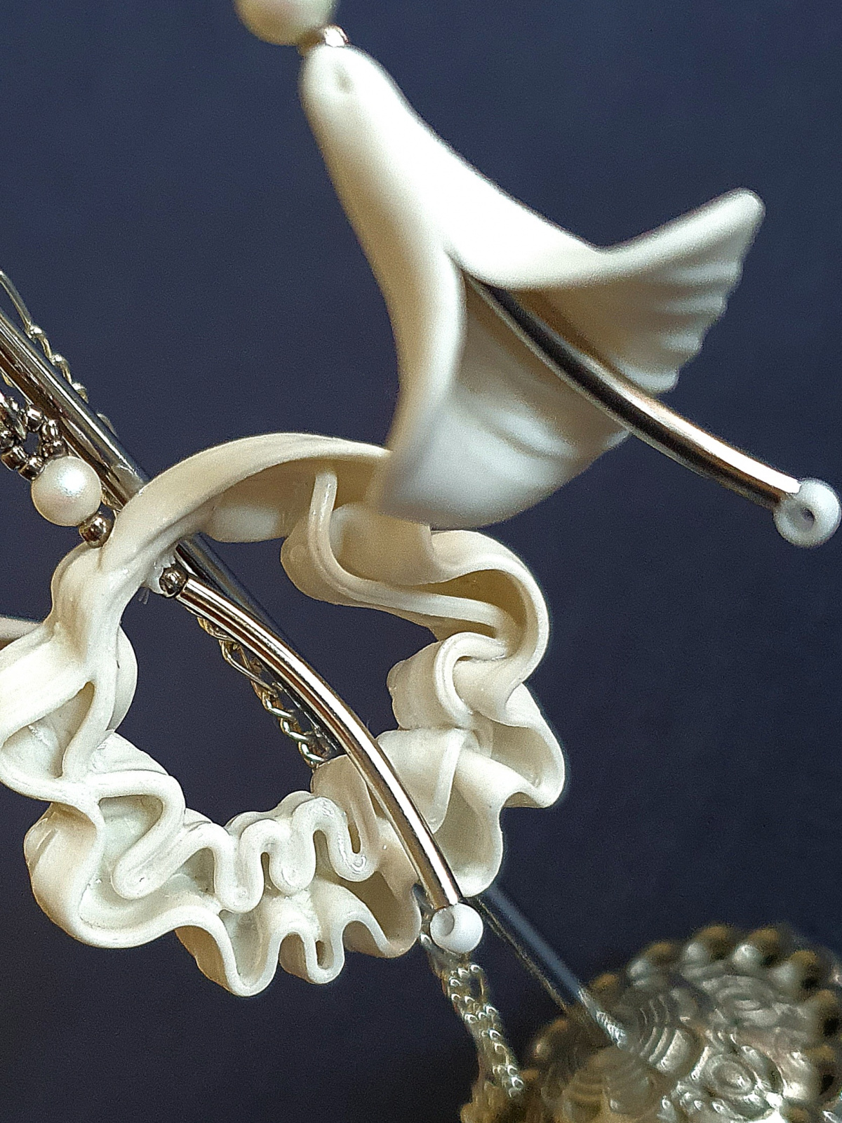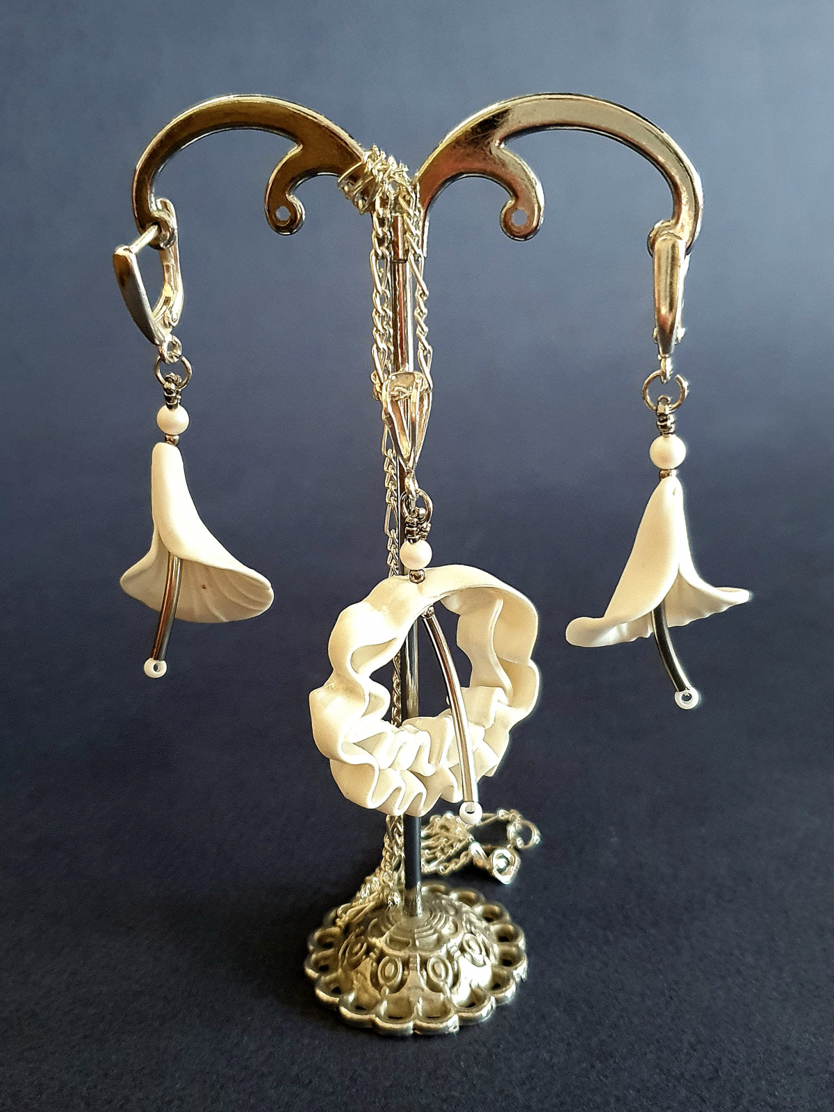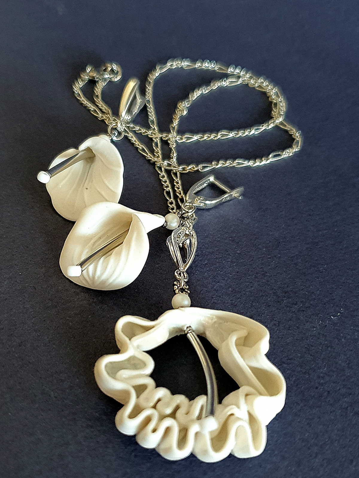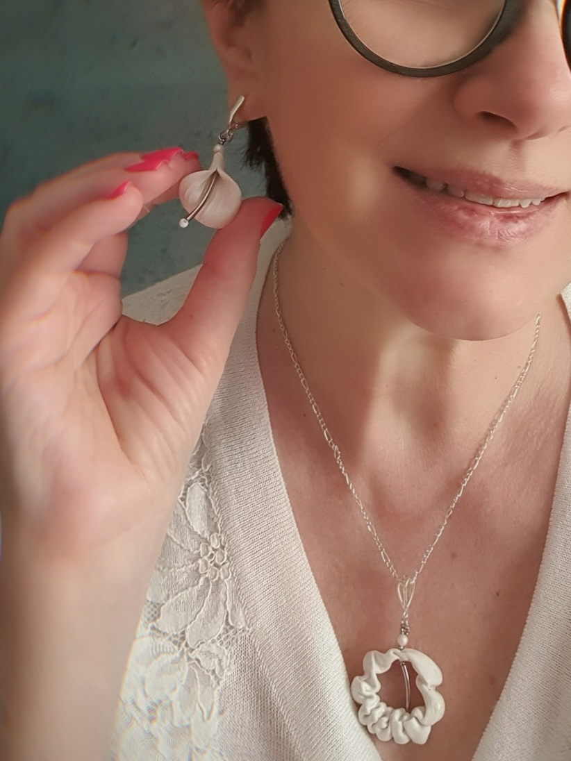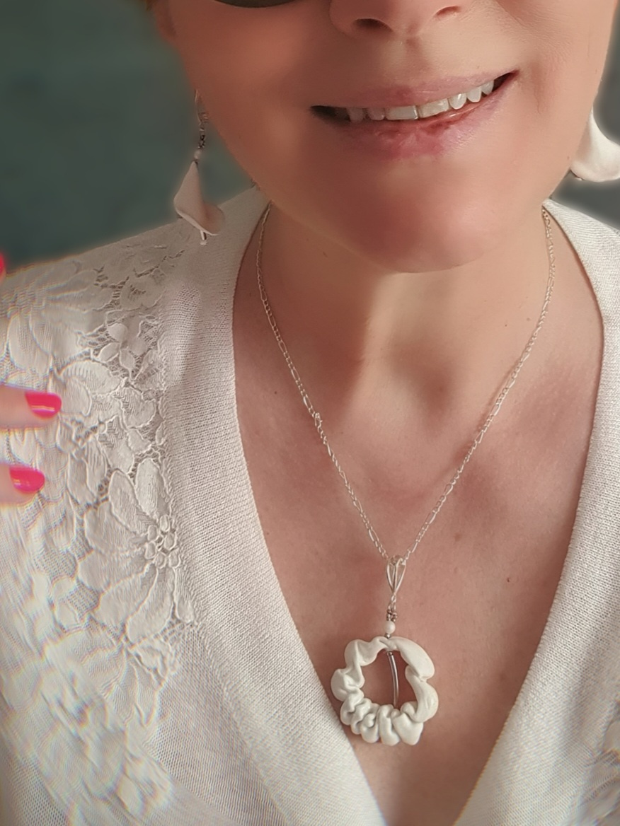В кулоне используется гафрированный английский фарфор, а серьги из бисквитного фарфора. Внутренняя сторона в сережках рельефная немного профлюсована и имеет легкий блеск.