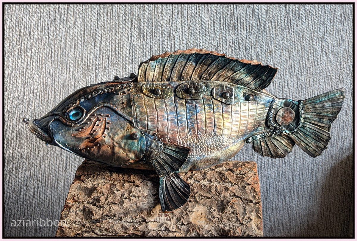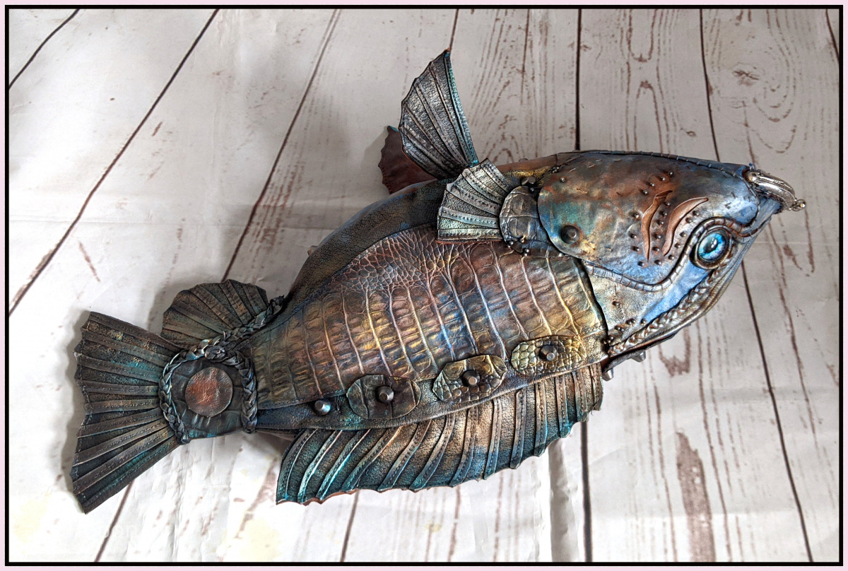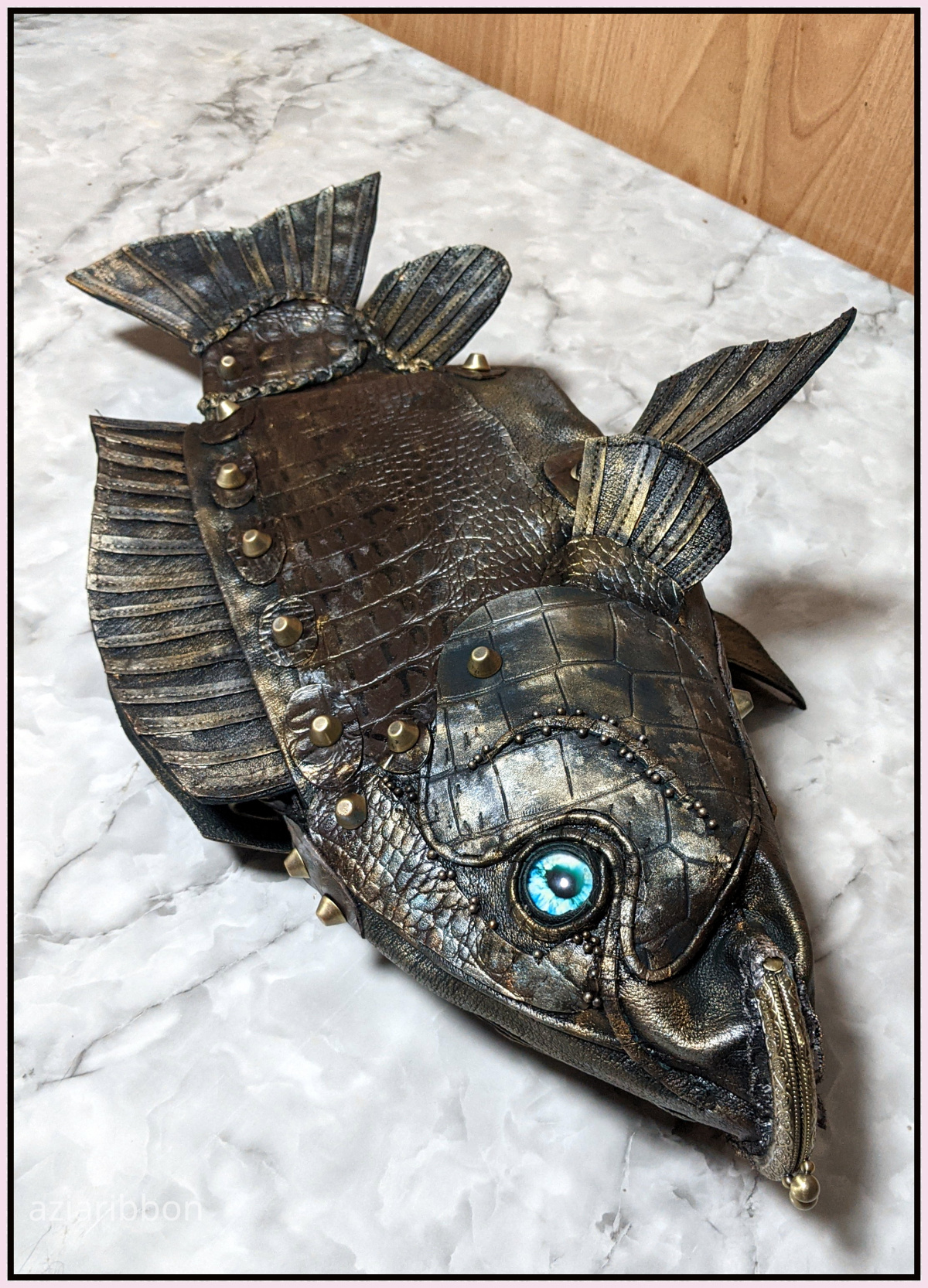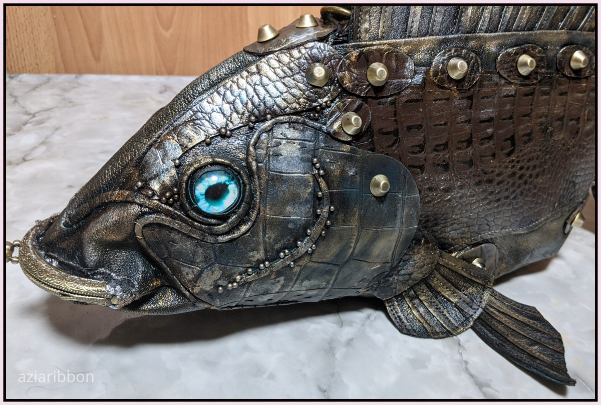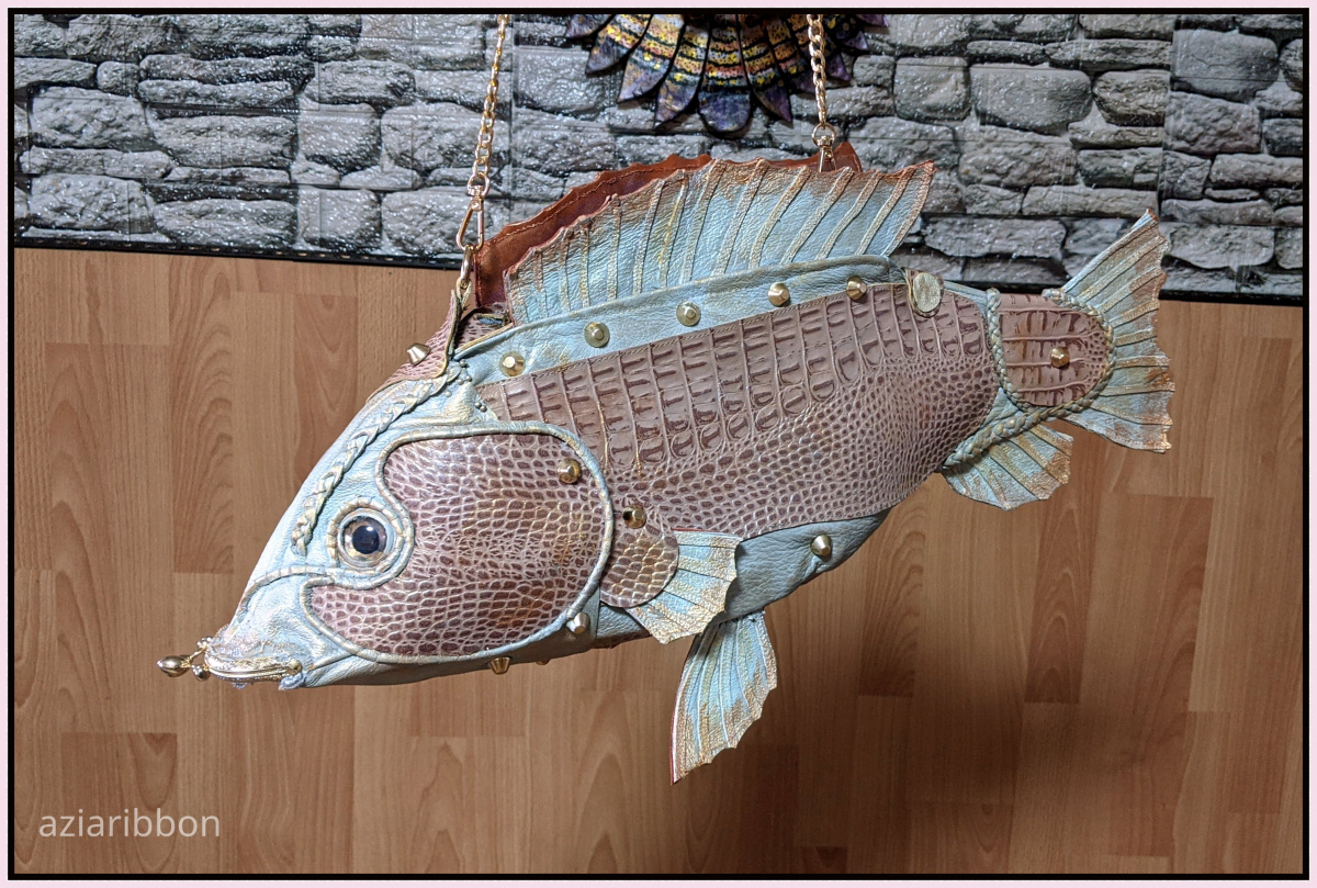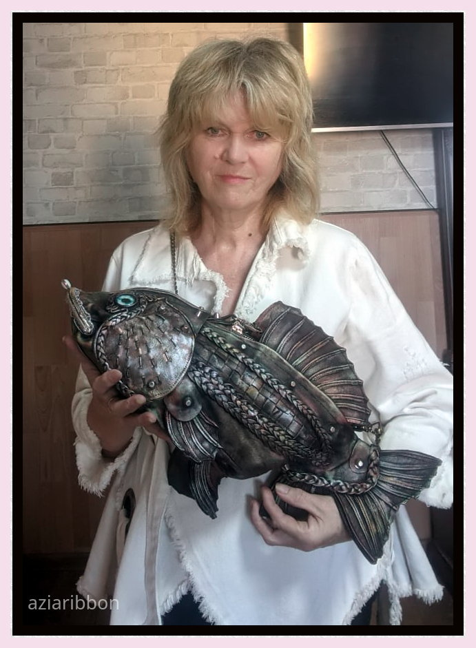 А розовато-рыжую рыбу взялась сделать, потому что мне кожу, что гладкую, что тисненую, прислали не того окраса, что я заказывала))) Отказываться не стала, забрала и «родила» такую рыбину. Я редко делаю светлых существ… Возможность есть, желания нет))) Мне больше нравится с темными цветами играть, да и рельеф на них лучше получается.