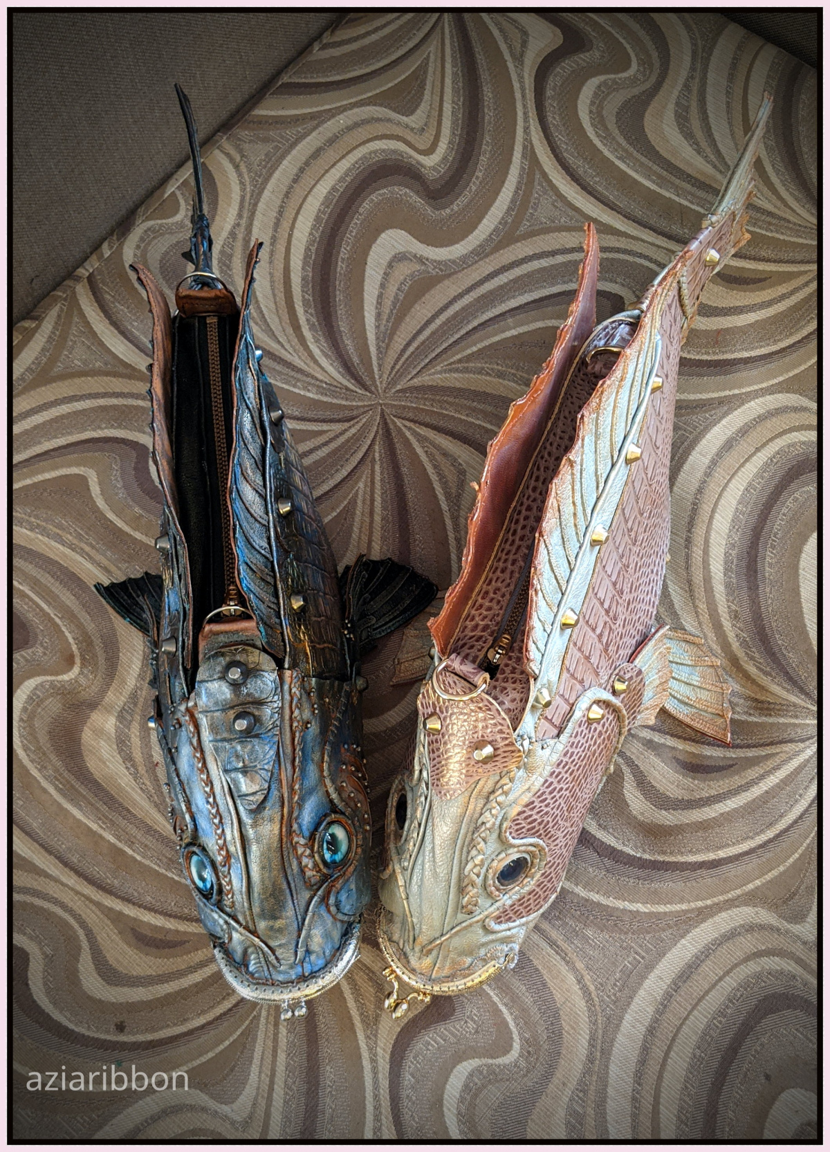 А вот пестро-синяя и светлая рыбы уже другой «породы»))) Хотела именно стройную фигуру и более изящные «аквариумные» формы) Поэтому для соблюдения пропорций взяла фермуары шириной 8 см. И рыбки получились некрупные. Не клатчевые, конечно, но вполне себе компактные) Кстати, вот их прототипы: