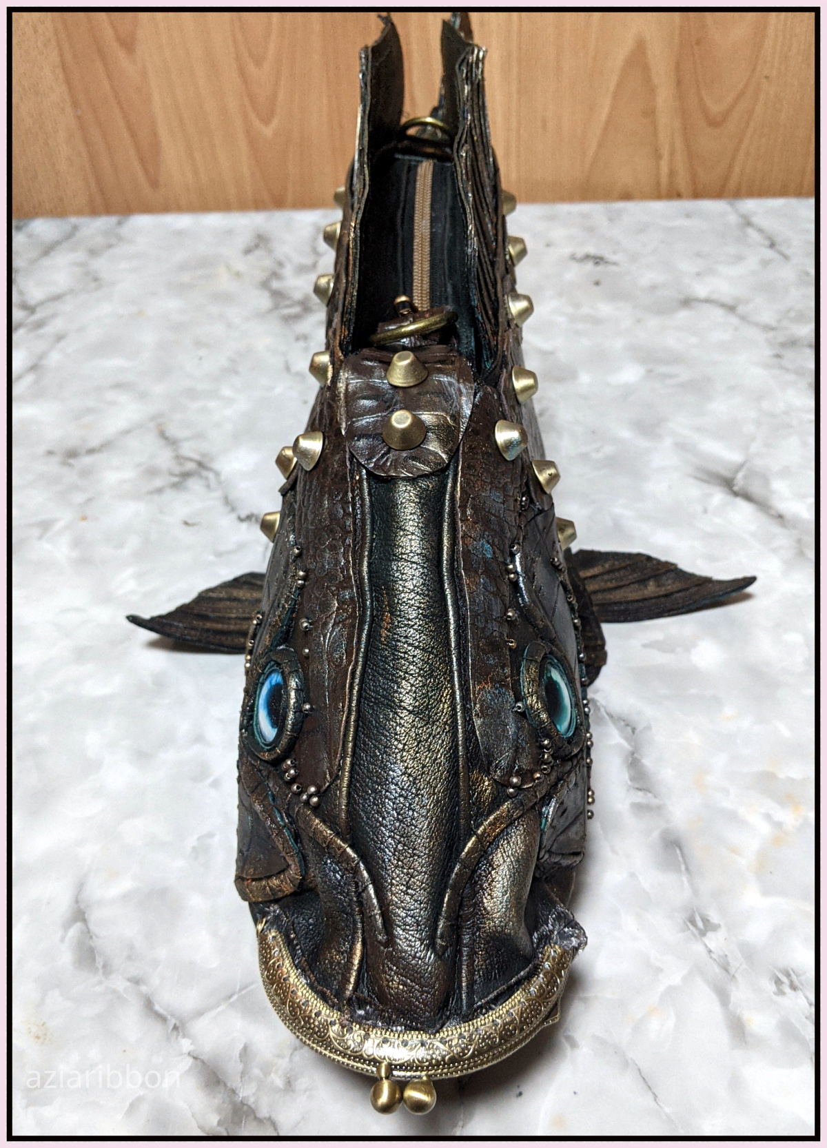 Большие сумки-рыбы только две. И то они не таких устрашающих размеров, как на фото получились. Но и не маленькие — 53 см с хвостом! Чтобы «рот» был наиболее функциональным отделением для мелочей, использовала фермуары шириной 16 см. Разумеется, к такой пасти пришлось и рыбу приделать соответствующую)))