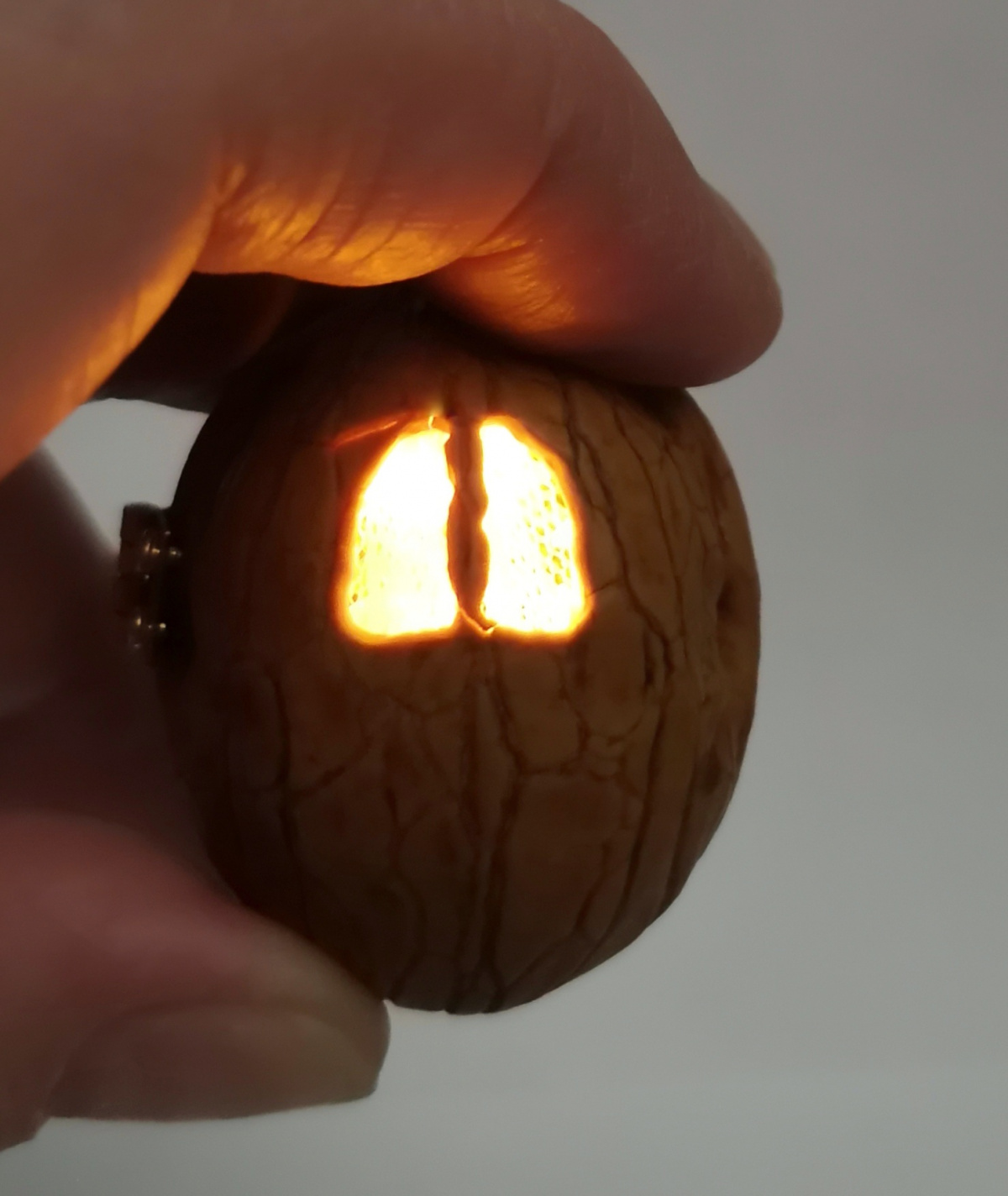 Из готовых фонариков на али я видела только минишарики (15мм) и «ракеты» (чуть побольше). В «ракетах» есть выключатель. Я думаю, что если раскурочить шарик, половинку со светодиодом повесить как «люстру», а вторую половину спрятать внизу и соединить их проводками — так вполне можно сделать. Но выключатель к шарику придется отдельно приделывать. Но вот чтобы поменять батарейки, боюсь, половинку с ними придется вынимать из ореха.