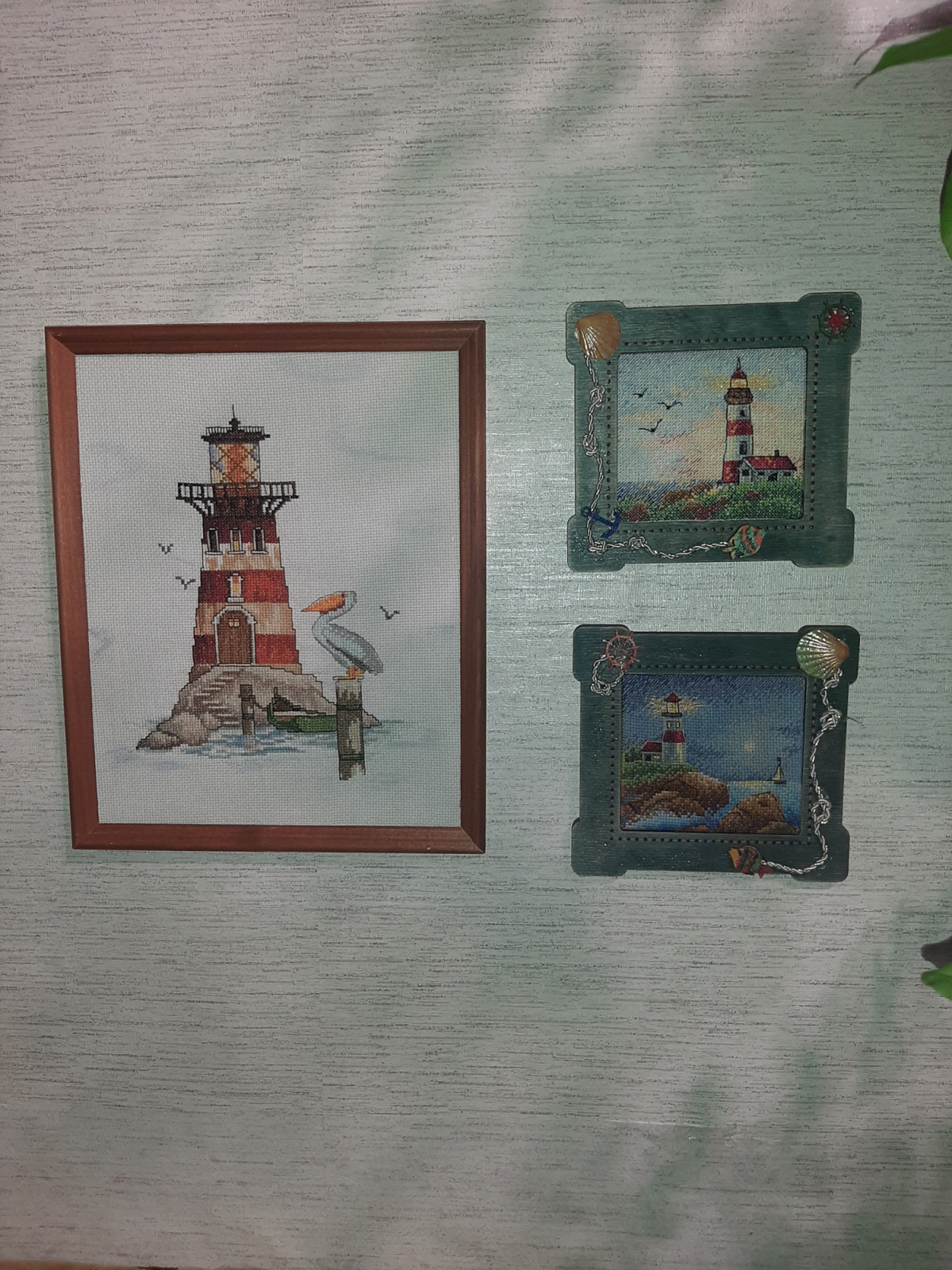 большой(относительно, конечно) маяк «Гнездо пеликана» готов, пеликан там другой, более жизнерадостный, несколько вышивок повесили в общий(с соседями) коридор, освободила место для маяков, вот висят на стенке,