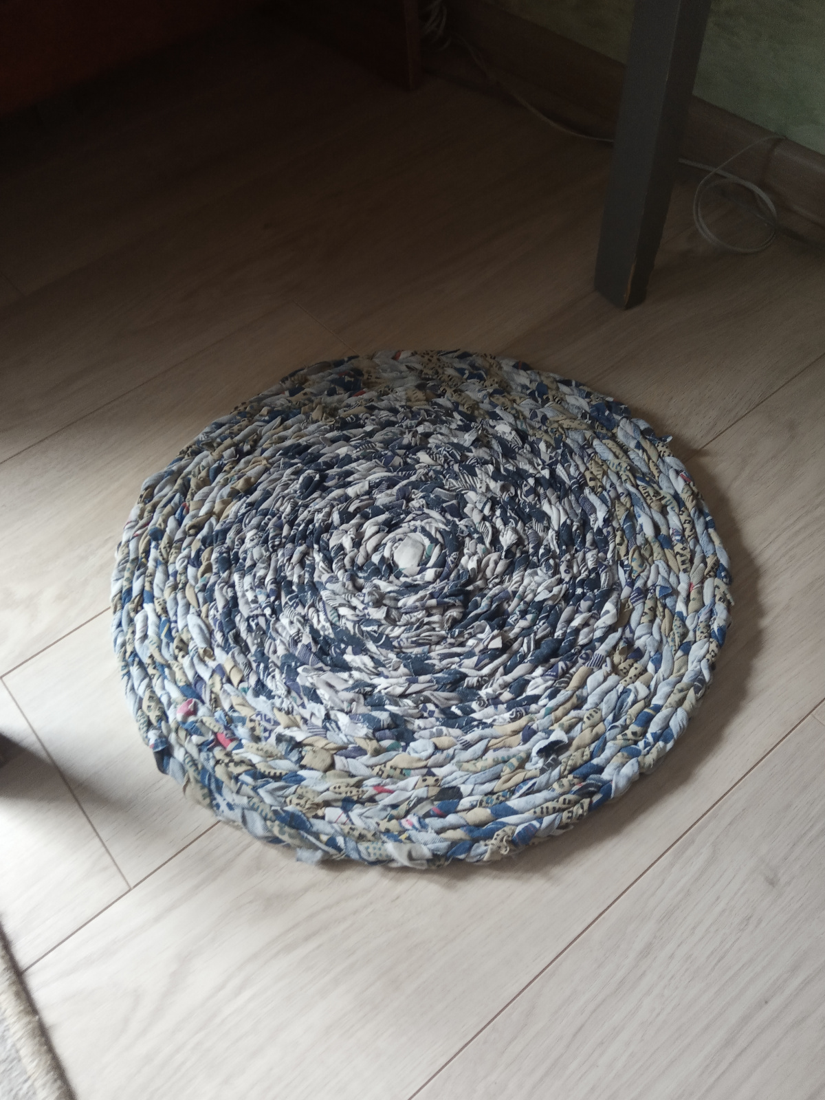 Другая идея из интернета тоже понравилась. Коврик из старых футболок. Тоже нашлось несколько футболок мужа, которые приготовила выбросить. Но… выбросить всегда можно, а вот попробовать интересно. Как человек ленивый, выбрала из большого множества видосиков на эту тему самый простой, чтобы без крючка и вязания. Футболки порезала на полосочки, из них сплела косу и эту косу свернула спиралью.