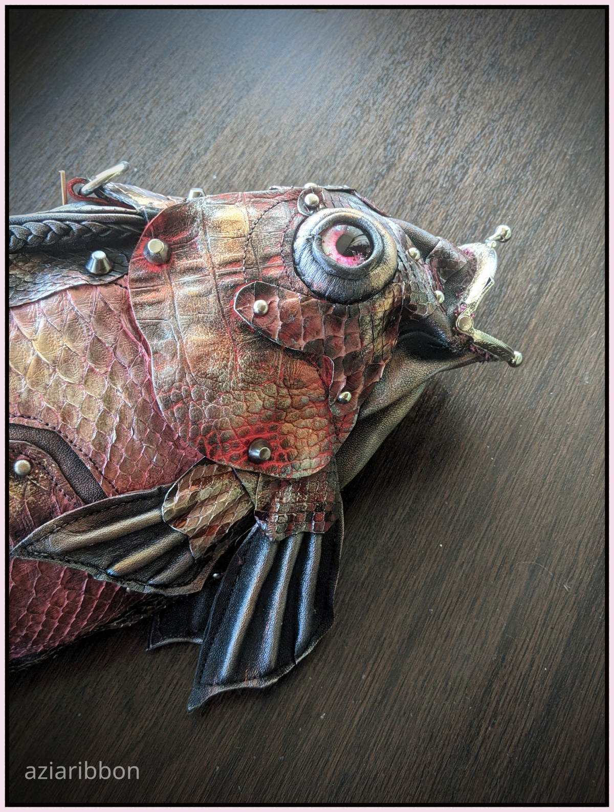 Тем более, хоть кожа и розовая, но она же питонья, фактурная, вся в змеиных чешуйках) Жалко ее на что попало тратить…