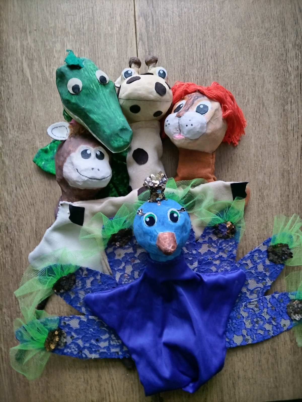 Это моя гордость — павлин, у которого с помощью спрятанной под рубашечкой верёвки, поднимается хвост. Хвост и корона украшены пайетками и сильно блестят, к сожалению фото это не передает.
