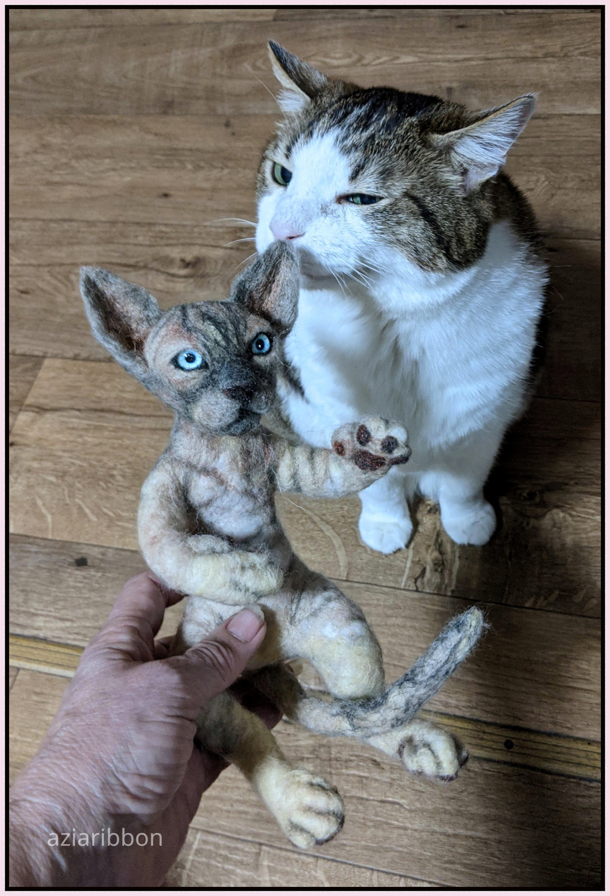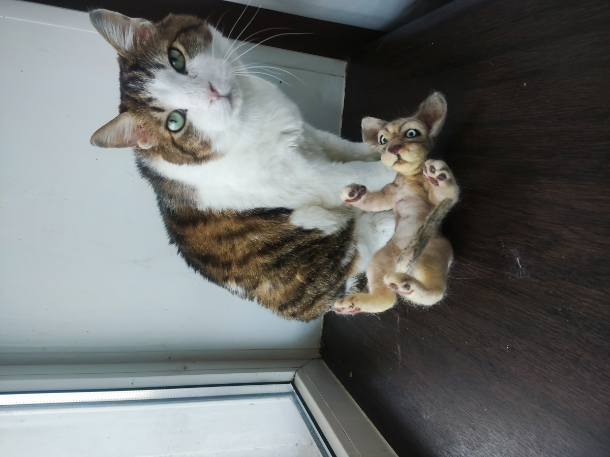 Позирует с рукодельным котом кот Азия Аксу Руслан, он же Белуша, он же дружище бобёр) Признать готов всё и всех!