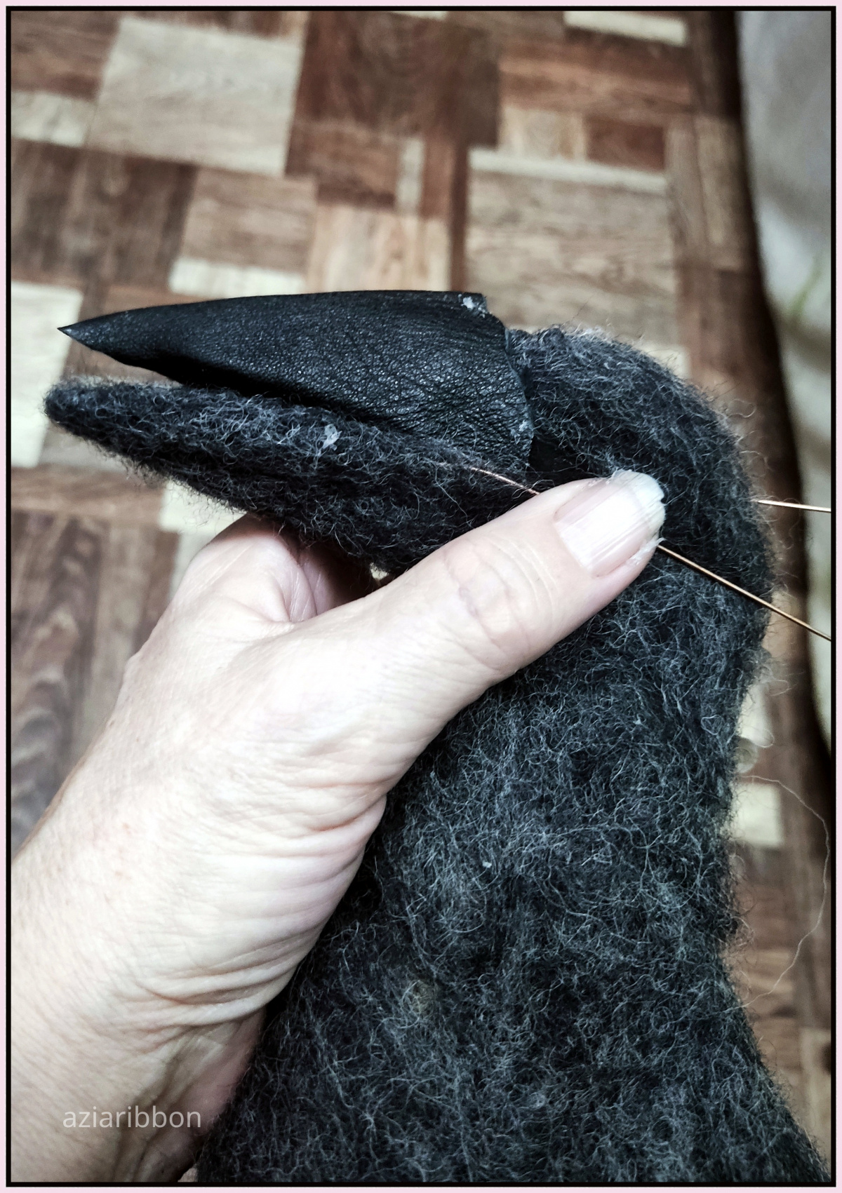 Клюв сваляла из шерсти. Потом решила оклеить его кожей. Потом оказалось, что нужна и нижняя челюсть, как у всех)))
