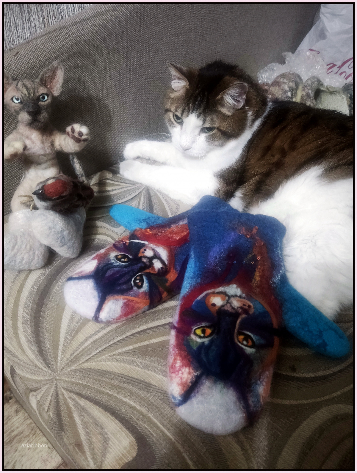 Есть у моей хозяйки кот. Болел он страшно. И превратился в скелет почти. И шерсть лезла с него. Ходил и качался. Вобщемветеринар дай Бог ему здоровья помог. Сейчас котик в нормальном виде.но шерсть таки собирала снего. Покупала расчёсочки разные ему, чтобы вычесывать колтуны. Вобщем шерсти собралось. Хотела мышку свалять в кошелёк или котика на память. Но пока не решаюсь. Не знаете ли вы, хорошо ли валяется кошачья шерстинка? Я очень люблю мягкую игрушку. Иногда подбираю на улице потеряшки. Часть уехала уже в мой город. Вот с месяц назад подобрала ещё одного без одного ушка. Может сваляю ему недостающее. Наверное это будет легче всего. Вдохновляете вы меня очень сильно на валяние!